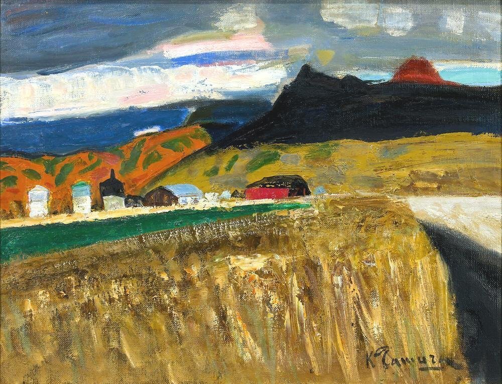 田村孝之介(1903年大阪市生まれ、1986年没)は、フォーヴ的な明るい色彩と装飾性を特色とする洋画家で、本名は大西孝之助。小出楢重や鍋井克之に師事し、二科展での受賞・会員推挙を経て、戦後は宮本三郎らとともに二紀会を創立、後に理事長を務めた。海外でも広く研鑽を積み、ヨーロッパ風景を多く描いたほか、日本芸術院会員・文化功労者にも選ばれた。
