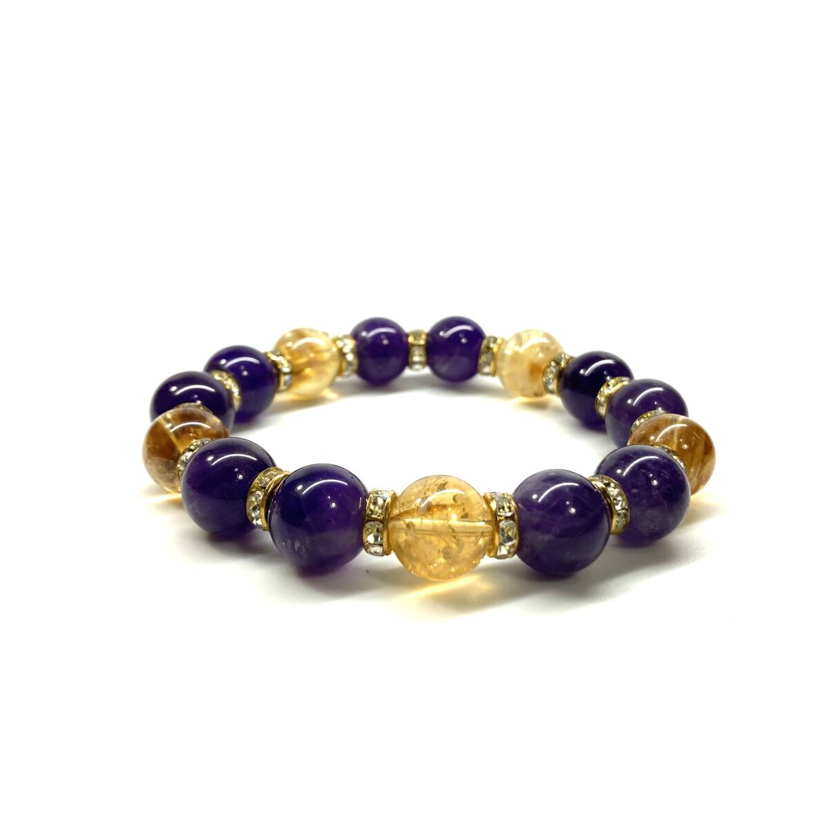 こちらは、シトリンとアメジストを組み合わせたパワーストーンブレスレットです。間にはロンデルを挟み高級感あるデザインに仕上げております。石大きさは12mm玉を使用して内周約18cmです。気になる方は是非この機会にどうぞ。
