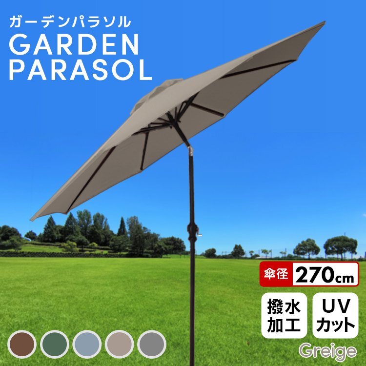 バーベキューにピクニックにビアガーデンと晴れた日には欠かせないアイテム! 日差しの向きにあわせて傘の角度調整ができる便利なガーデンパラソルです。 パラソルの開閉には、普通の傘とは違いハンドル式を採用。 ハンドルをクルクルと回すだけで開閉できるので、これほど大きなパラソルでも女性一人で簡単に開閉できます。 UVカットが施された270cmという大きなパラソルが強い日差しから守ってくれるので、 直射日光を気にせず快適にガーデンライフを楽しんでいただけます! アルミ製支柱なので木製パラソルと比較して軽量! ご自宅のお庭、バルコニー、テラスや店舗先のカフェペースなどにお使いいただけます。 河原でのバーベキュー、夏場にお子様のプール遊びの時にご使用になっているお客様もいらっしゃいますよ 【商品仕様】 ・カラー:グレージュ ・サイズ:(約)φ270cm×H240cm ※ポールの直径:(約)3.8cm ・収納時サイズ:(約)140cm×25cm ・重量:(約)4.6kg ・素材:ポリエステル、スチール、アルミ他 ※パラソルベースは別途ご用意ください※ 【注意事項】 ・傘生地には撥水加工をしておりますが、完全防水ではありません。 ・風や雨が強い日の使用は危険ですので、ご使用しないでください。 パラソルやベースを地面に固定しても突風や瞬間的な豪雨などでパラソルが破損する場合がございます。 そのような自然現象による破損につきましては保証の対象外となりますのでご注意ください。 ・商品は、モニターによって色合いが異なって見える場合があります。 ・仕様・デザインは改良のため予告なく変更することがあります。 |