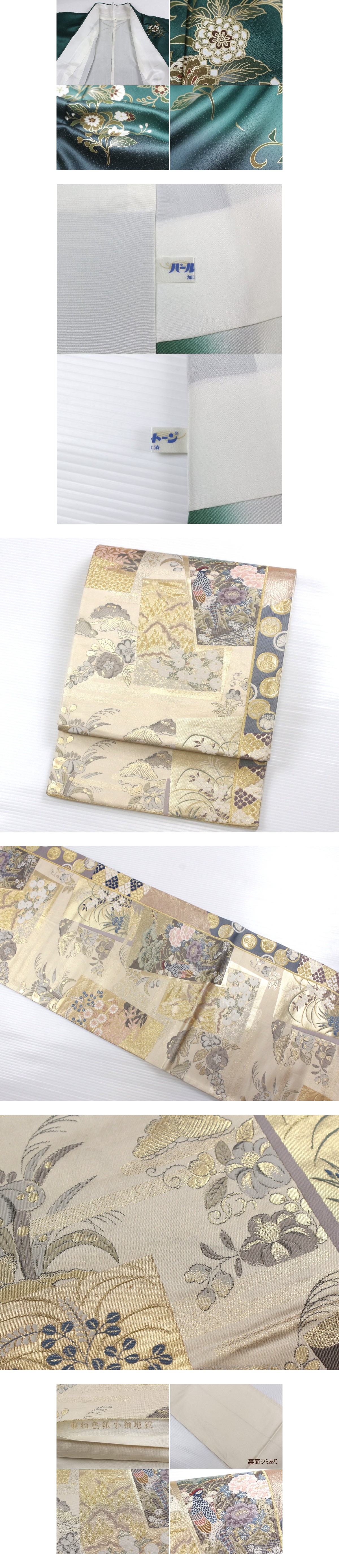 美しい訪問着と袋帯のセットのご紹介です。 深みのある緑系の地色に、裾へと静かに溶け込むような暈しが施された訪問着。 裾元には、唐草調の蔓をのびやかに描いた草花文様が配され、白や金彩を基調とした花意匠が上品な華やぎを添えています。意匠は控えめながらも配置にゆとりがあり、歩みとともに表情が生まれる、洗練された佇まいが魅力です。 合わせた袋帯は、色紙風の文様と、花鳥・雲文・草花文様などを織り込んだ格調高い一本。 異なる文様を巧みにまとめた構図ながら、全体は柔らかな調和を保ち、訪問着の落ち着いた地色を美しく引き立てます。 華やかさと品格を併せ持ち、後ろ姿に奥行きをもたらす存在感があります。 末永くご愛用いただける和の装いとして、お手元でお楽しみください。 ※撮影時の部屋の照明によって画像の色に若干の差がございます。色味に差がございますことをご了承のうえご検討下さいませ。 …状態… 着物:目立つ難なし。 帯 :締め跡。裏面にシミあり。 ※全くの新品ではございませんので、記載のない変色やスレ、ヤケ、その他僅かな難がある場合がございます。そのような理由でのキャンセルはお受けできませんので、ご了承の上ご検討お願いいたします。 |