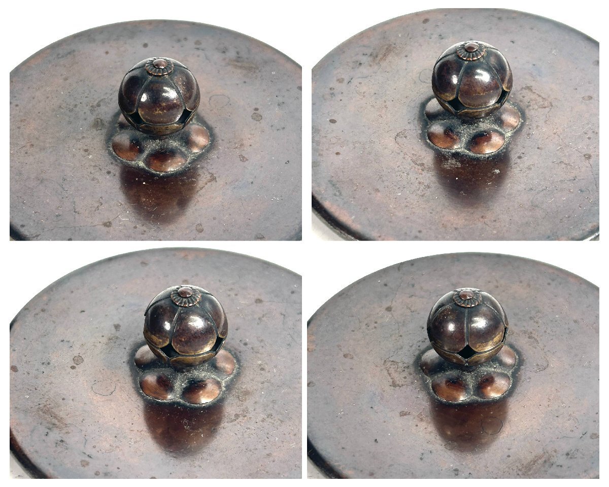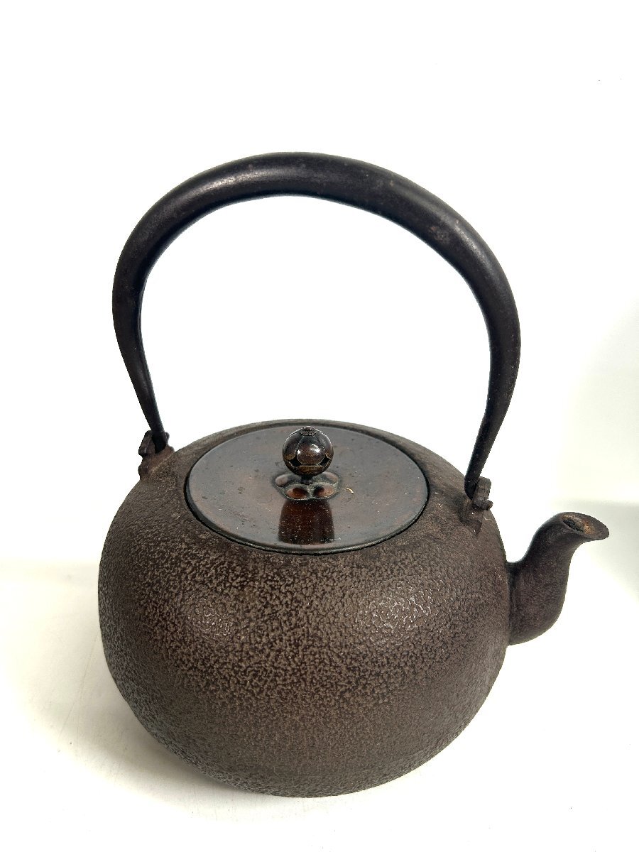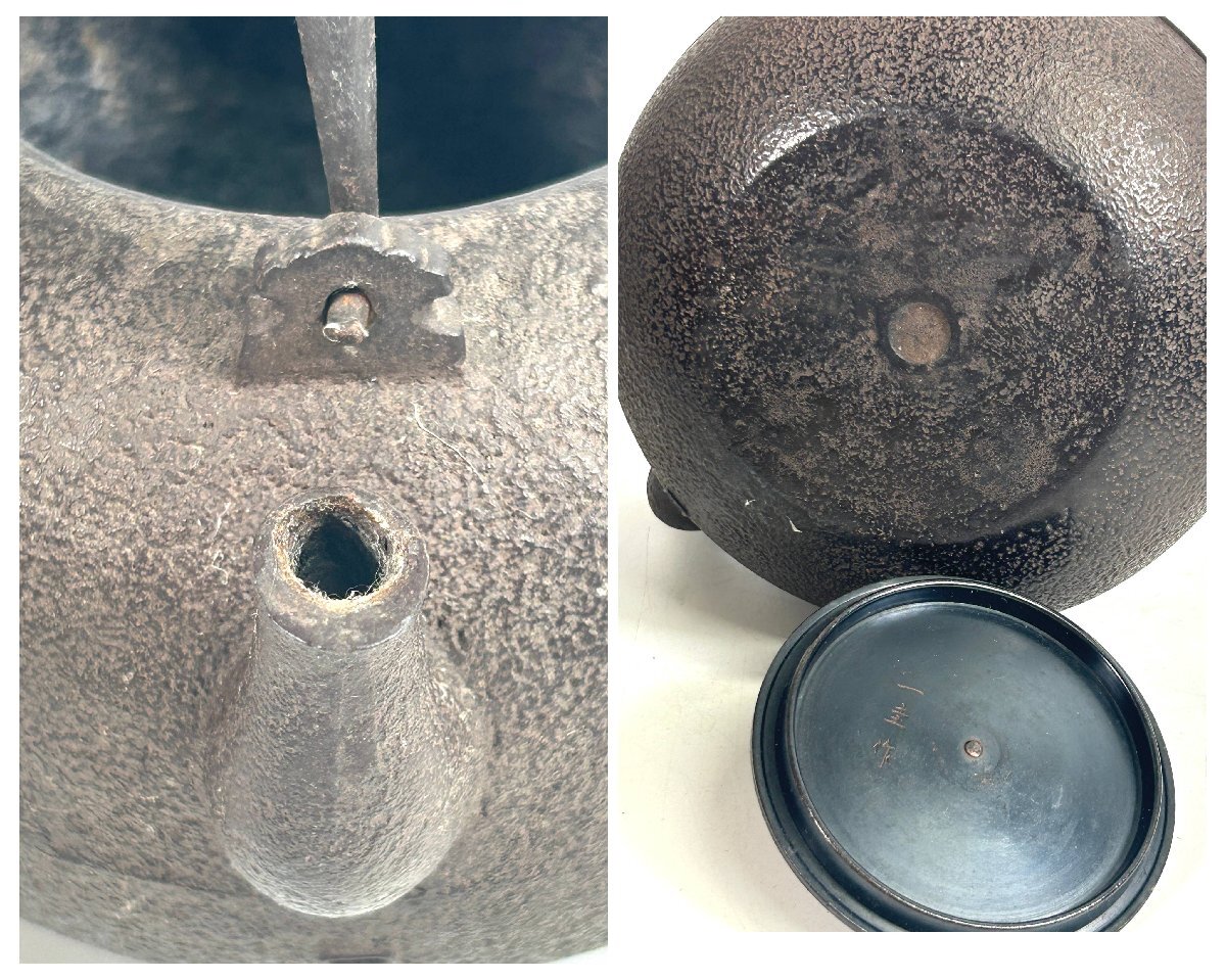 鉄瓶の全体的に埃の付着やサビ、変色汚れ等がございます。