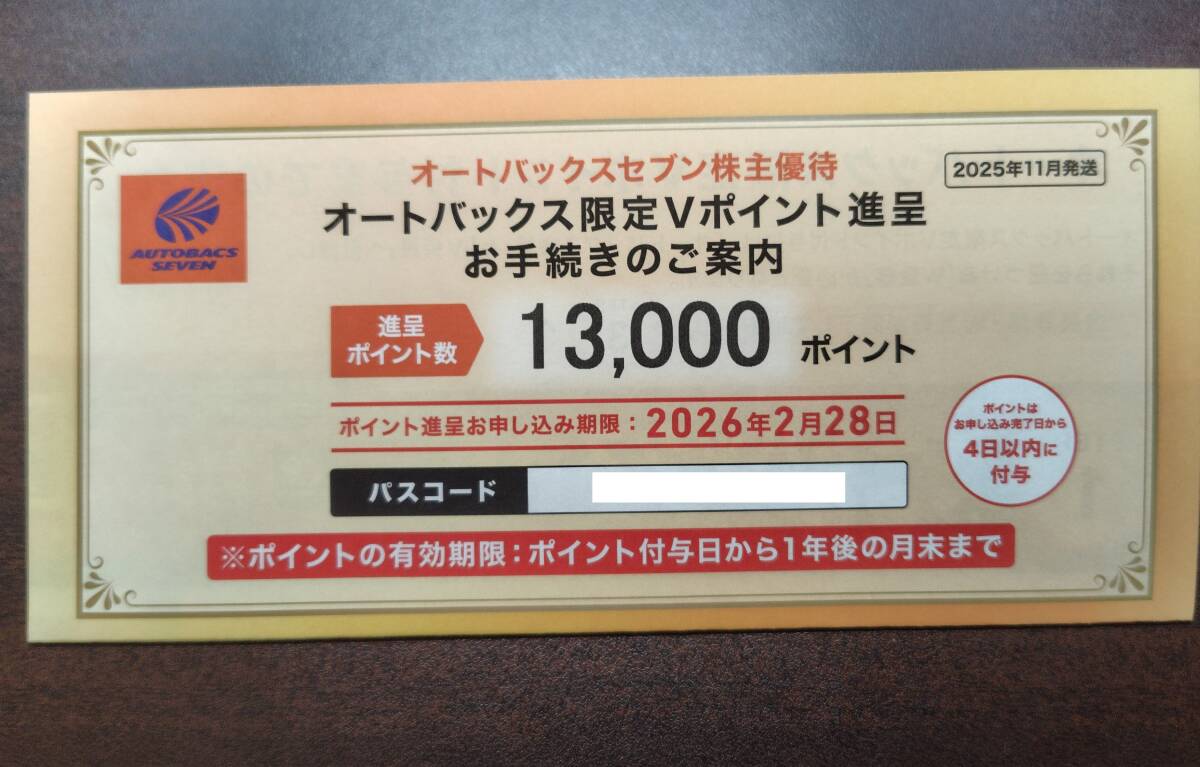 ■オートバックスの株主優待 限定Vポイント13000円分となります