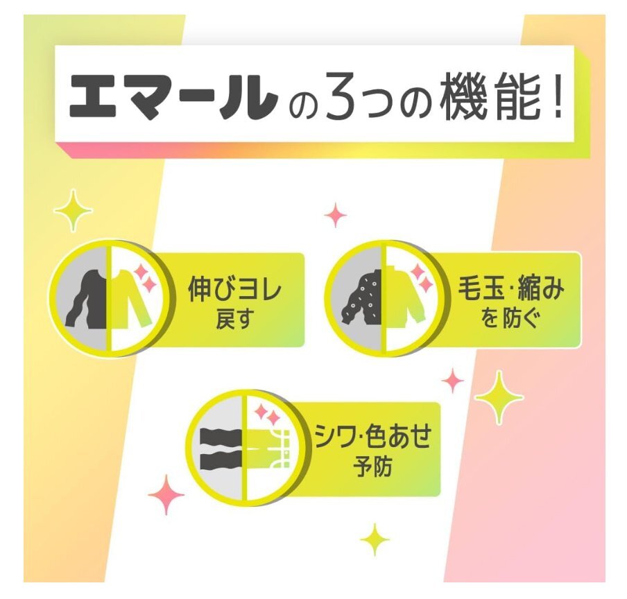 | 商品の説明 | ニットもカジュアル服も伸びヨレ戻す、洗たく用洗剤(おしゃれ着用)。 ニットのキレイ寿命2倍!ダメージリペア技術でセンイを内側から補修。 蛍光剤無配合・中性。 商品の特徴 ●伸びヨレ戻す ●毛玉・縮みを防ぐ ●シワ・色あせ予防 ●汗・皮脂すっきり洗浄 ●ニットはもちろん、カットソー・パンツ・スカート・ワンピースなどのカジュアル服や、大切に洗いたいランジェリー・制服にも使えます。 ●リフレッシュグリーンの香り |