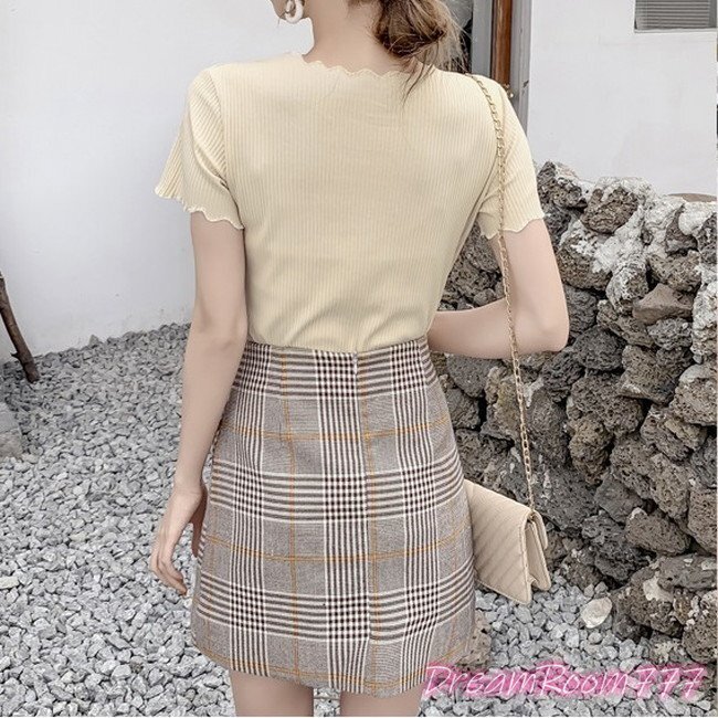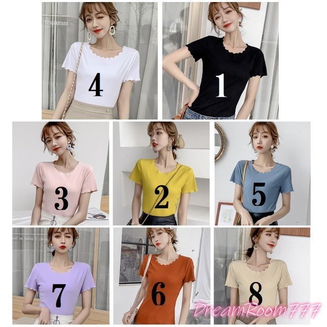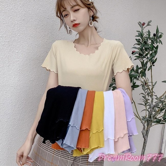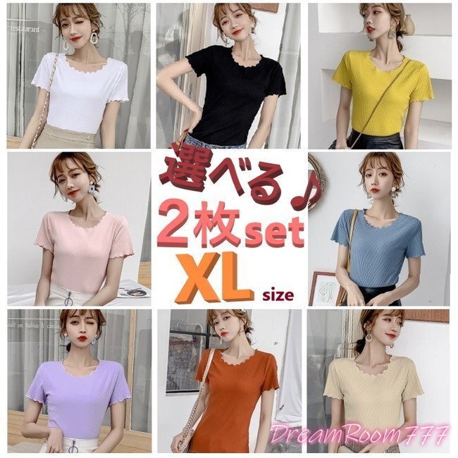選べる2枚★Solid color ラウンドフリル Tシャツ XLサイズ 美ライン 半袖 レディース オフィス カジュアル 無地 綺麗め K-088