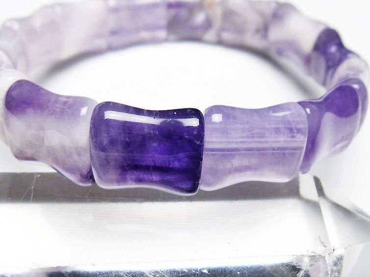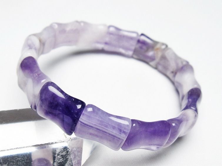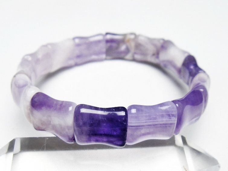 | ■商品名: アメジストバングル ■商品ID: T281-1774 ■商品重量:約 26.8g ■商品サイズ: 高約:15mm 横約:12mm 厚約:7mm 内径円周約:168mm(±5mm) 【アメジストクォーツ(紫水晶)】 アメジストは鉄分によって紫色に発色した水晶の一種です。 名称はギリシャ語で酒の意味のmethyと否定辞のa、つまり「酒に酔わない」「この石でできた盃で酒を飲めば悪酔いしない」に由来するとされています。 「酒に酔わない」と言われる通り、アメジストは体調面への作用が大きく、血液を浄化して解毒、解熱作用を高め皮膚病の治療や不眠を解消するのにも用いられたと言われています。 アメジストは真実の愛を導く愛の守護石とも呼ばれ恋愛運UPの石としても広く知られています。 理想的な出会いをもたらす効果や持ち主に美や調和を与え、セクシーな魅力を引き出すとのことですので恋愛成就のお守りとしても最適といえるでしょう。 また、くよくよしたり傷ついたりしている時には癒し、目前の困難を乗り越えていけるように精神を強くするヒーリング効果も期待できます。 不眠にも効果があるとされていますので、ストレスを抱えている人にもおすすめの石です。 ⇒ アメジストをもっと詳しく ◆ワンポイント情報 アメジストは産地によって結晶や色味の傾向が変わります。 例えばブラジル産は結晶が大きめだが色味は少し薄め、ウルグアイ産は結晶は小さく細かいが色味は濃紫の傾向、メキシコ産は細長い結晶でライラックの様な明るく透明感のある紫など特徴が異なります。 産地による好みが人によって分かれるのもアメジストならではと言えるでしょう。 |