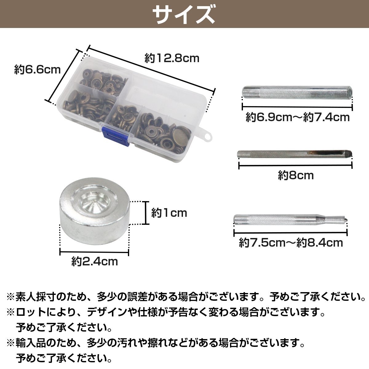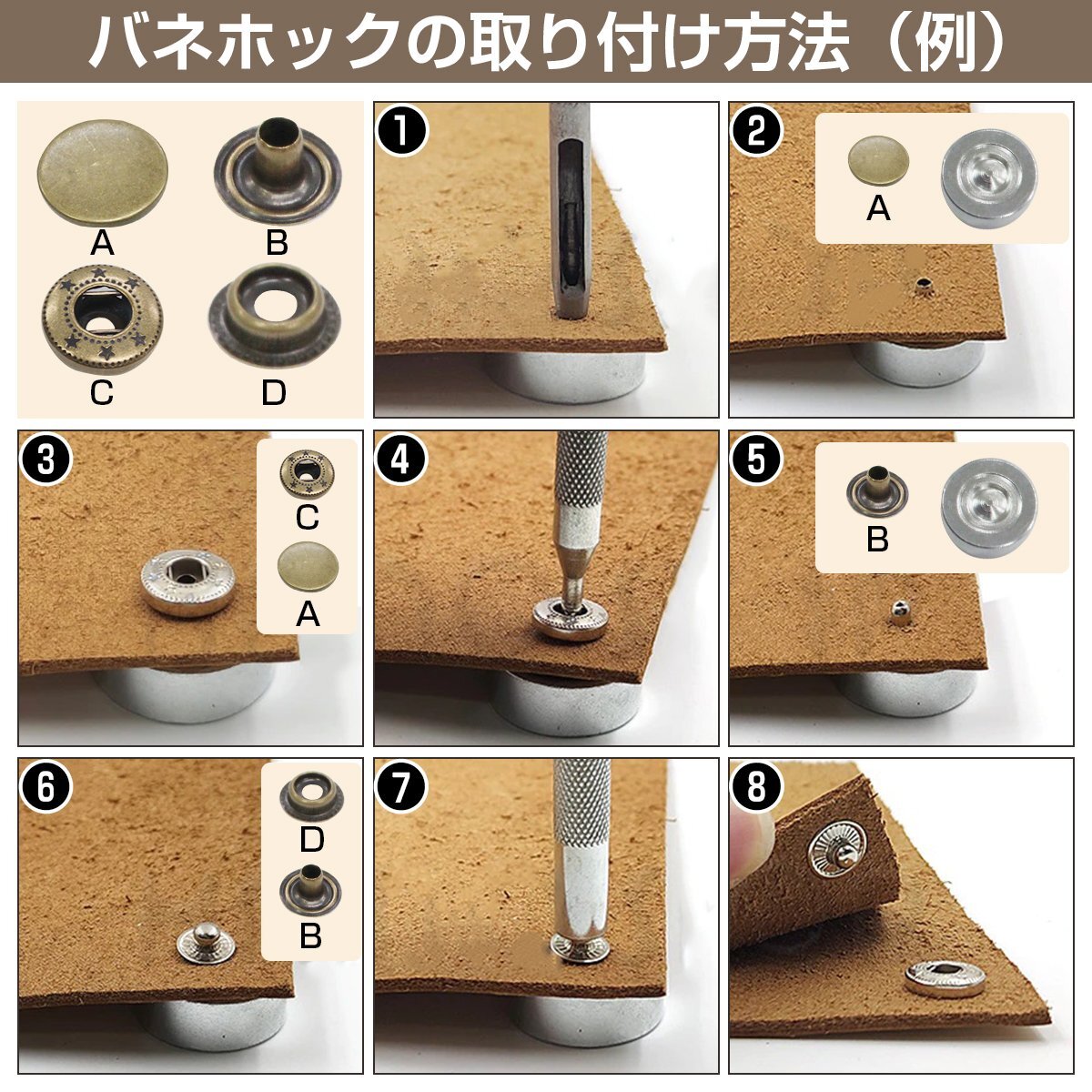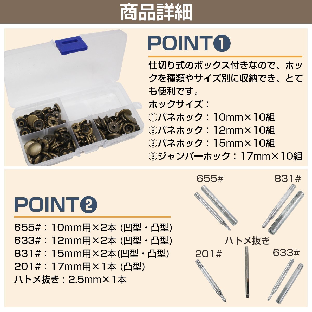 【送料250円】バネホック ボタン 4種 各10個 40組セット レザークラフト 打ち具 10mm/12mm/15mm/17mm ハンドメイド ジャンパーホック 革