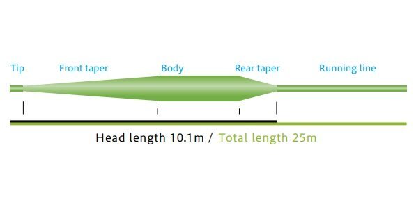 全長 25mのリーズナブルな WF ラインです。ヘッド長が 10.1mと短く入門者の方でもフォルスキャ ストからシューティングまで容易に行えます。キャスティング練習用としてもたいへんお勧めライン です。