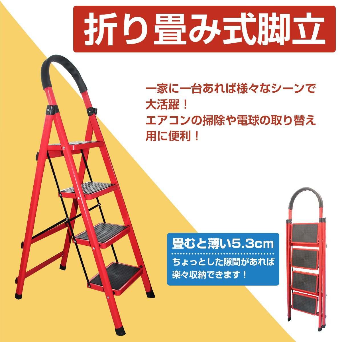 折りたたみ 4段 レッド/赤 ハシゴ はしご 梯子 脚立 足場 96cm アルミラダー 踏み台 4段ステップ 屋内用 ラバー ゴム