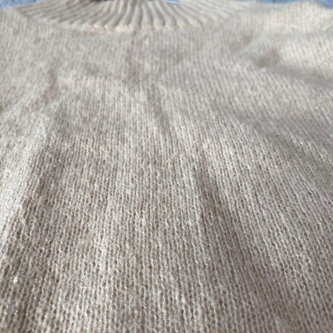 ベージュ長袖セーター、リブ編みの襟と裾が特徴。