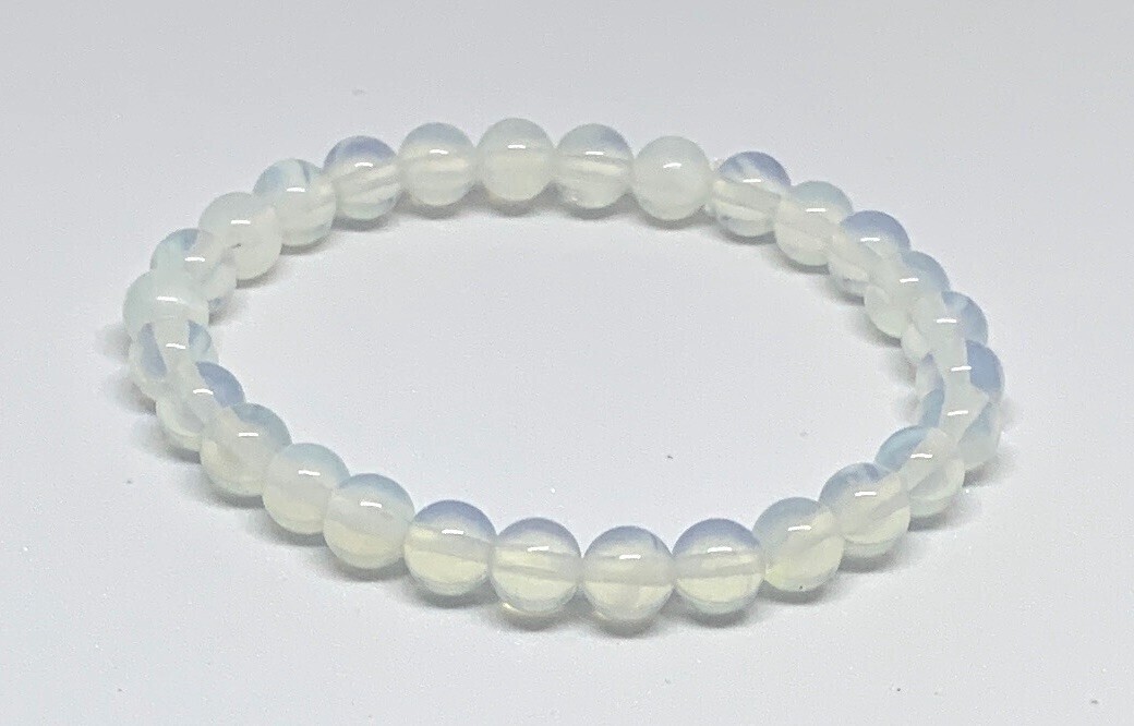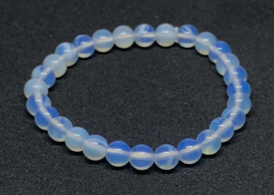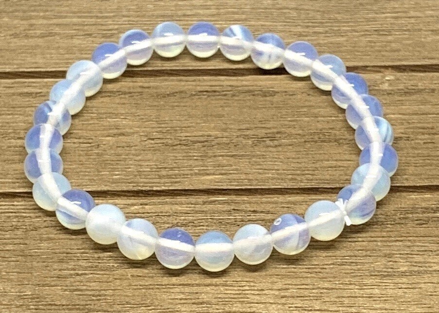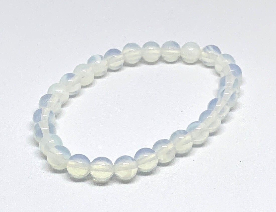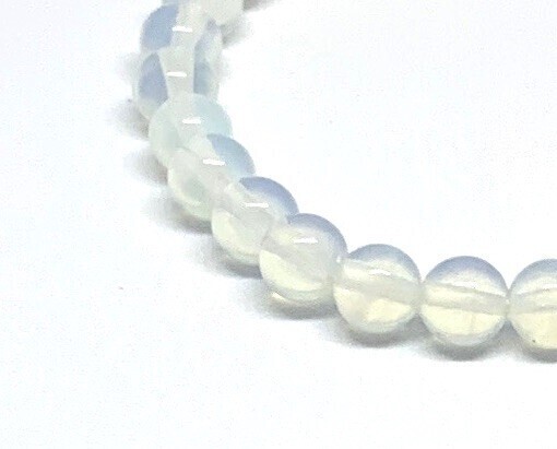 繊細なオパール(蛋白石)6ミリ珠を使用しています。宝石品質(プレシャス)ではありませんが、とても優しく光ります。白と透明とブルーのナチュラルなグラデーションが美しいです。手首周囲 15.5センチまでの方に