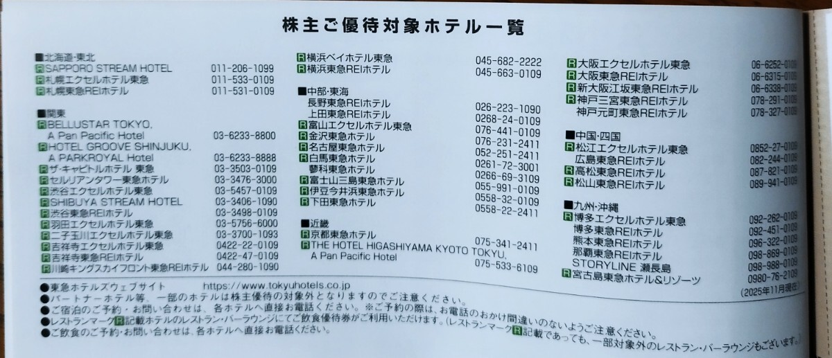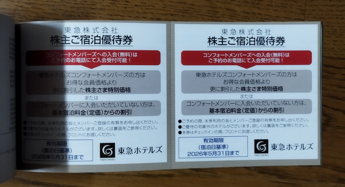〇東急ホテル、東急イン、エクセルホテル東急、東急リゾートなどで客室正規料金の30%割引券8枚(一枚で一泊一室ご利用)
