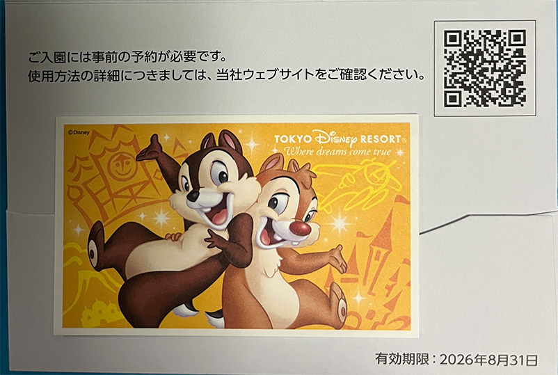 「東京ディズニーランド」 または「東京ディズニーシー」どちらからのパークを1日楽しめる「1デーパスポート」1枚です。 有効期限は 2026年 8月 31日までです。 事前の予約が必要です。 特別営業時間(年越し特別営業など)は、ご利用いただけません。 株主用パスポートの使用方法は↓をご覧ください。 | ||