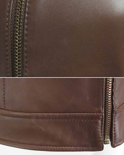 | シンプルなデザインでカッコイイレザージャケット。カジュアルスタイルにもきれい目スタイルにもあわせて頂けるデザイン。茶色なのでハードになりすぎずソフトな雰囲気で着て頂けます。ファスナーの持ち手やボタンにはブランドロゴが刻まれています。 |