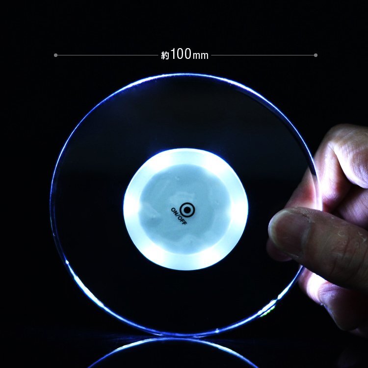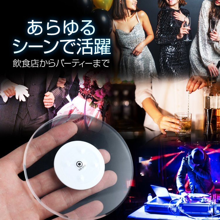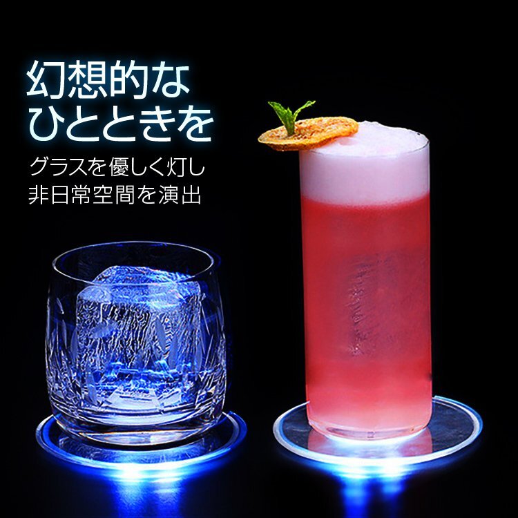 グラスを優しく灯し、非日常空間を演出するLEDクリアコースターの2枚セットです。