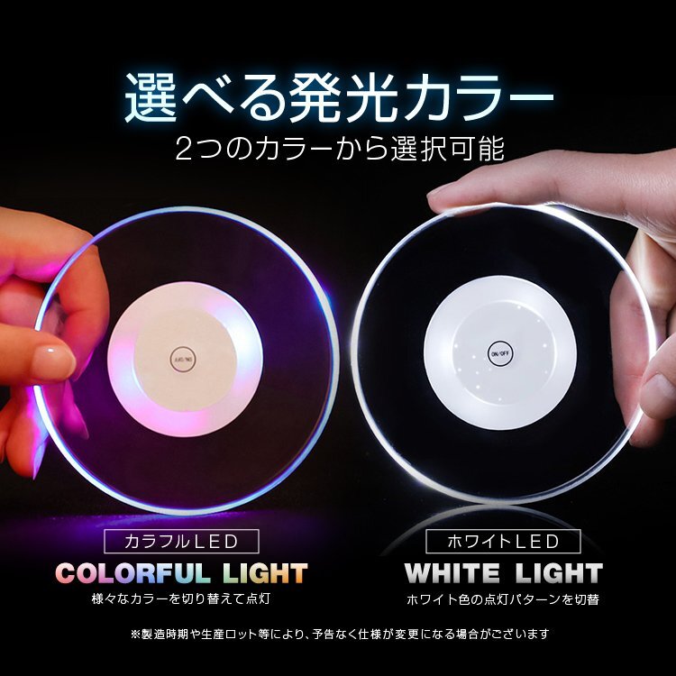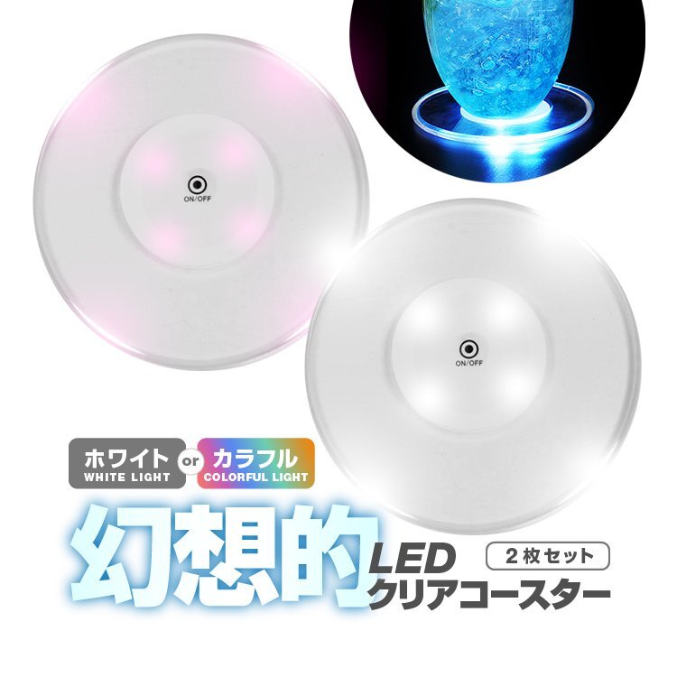 ◆幻想的に灯す LEDクリアコースター 2枚セット ホワイト カラフル 電池駆動 点灯モード切替 透明LEDカップマット 光るコースター グラス バー キャバクラ パーティー などに【ホワイト】CLECM02S