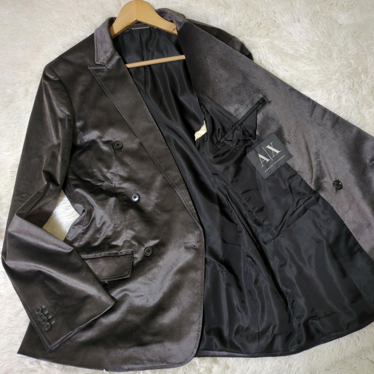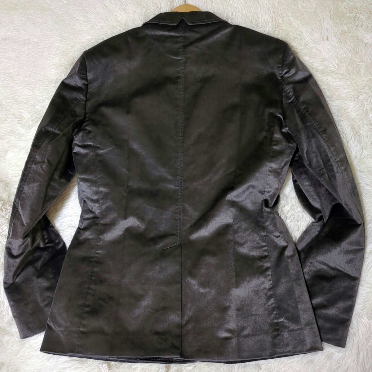 ストレッチ性もあるレーヨン/コットン素材で(肩パッド有。背面裾はセンターベントでしつけ糸が付いております。)、色はグレー系です。