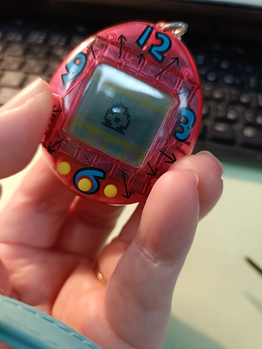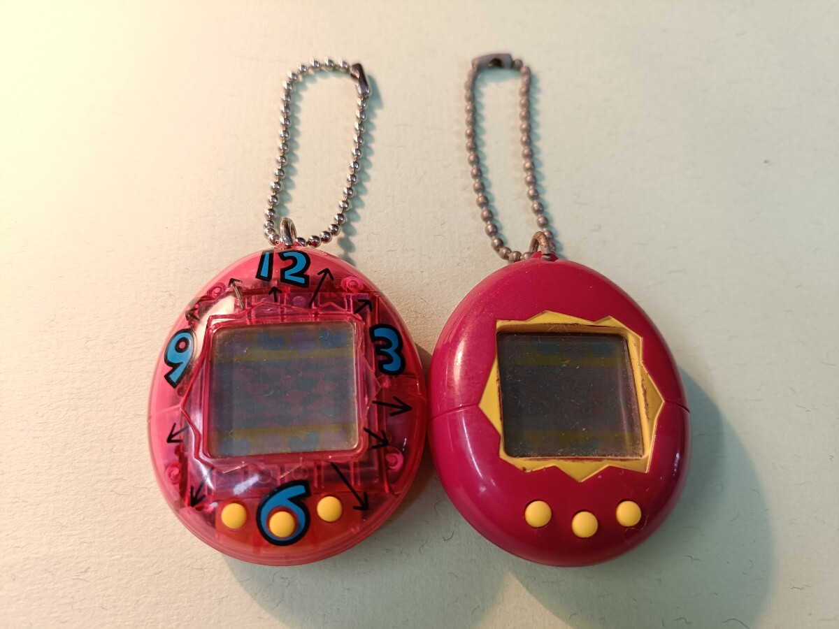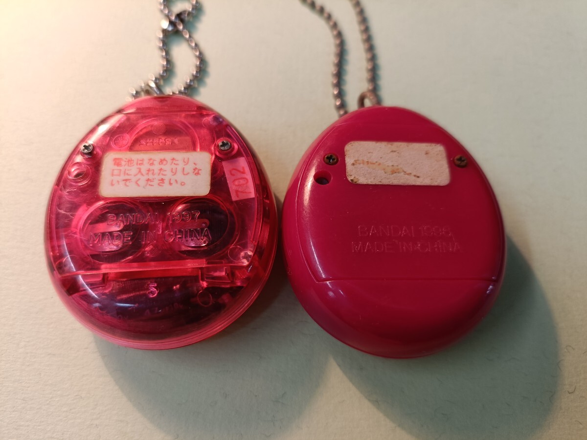 初代たまごっち2点です。ピンクの方は使用感スレなどありチェーンがくすんでいます。スケルトンの方は綺麗です。どちらも動作は確認しています。電池はつきません。