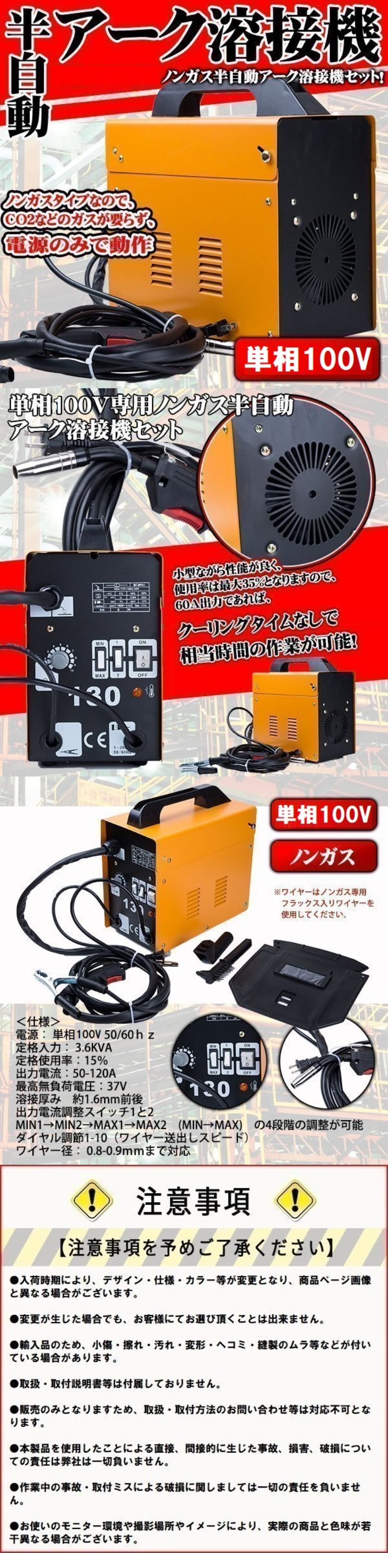 半自動 アーク 溶接機 120A MIG130 ノンガス 単相 100V 半自動溶接機 プロ ノンガスタイプ 小型 コンパクト 溶接