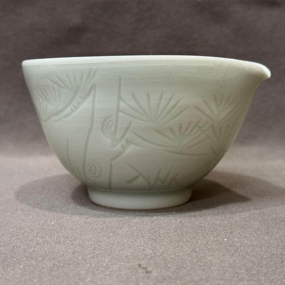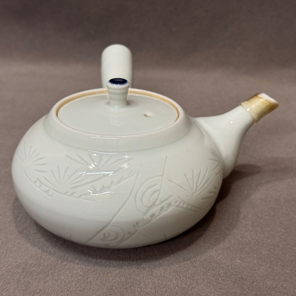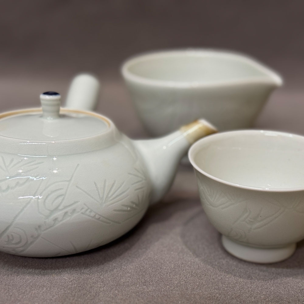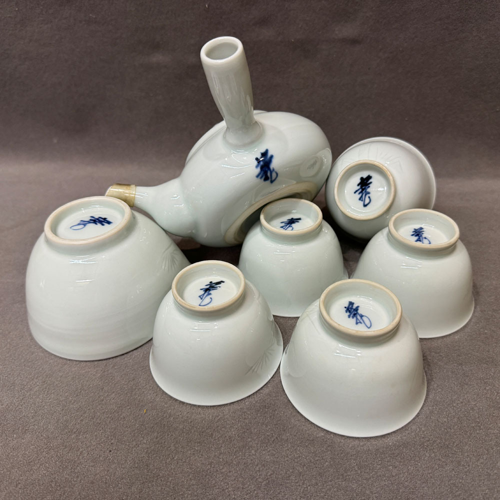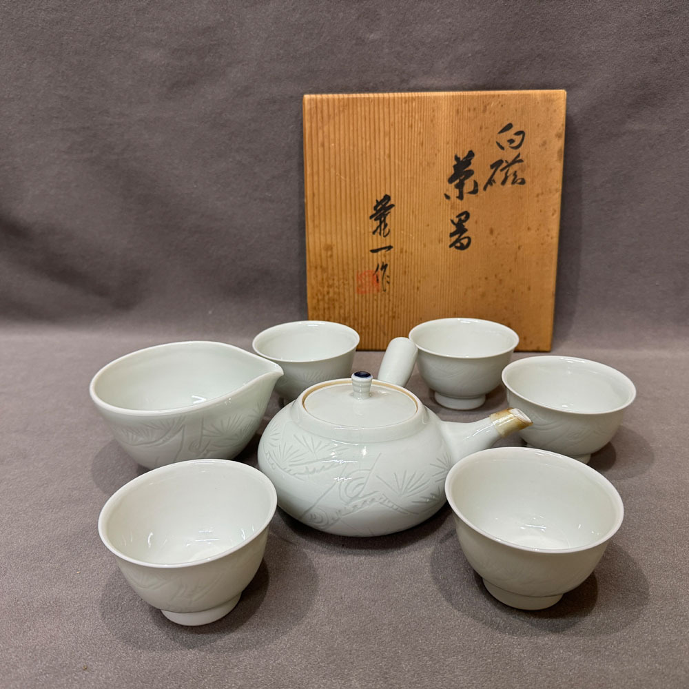 | ● 真作 国宝 篠田義一 煎茶セット 白磁 松文様 急須 湯冷まし 茶碗 5客 煎茶道具 共箱 ● | |||||||||||