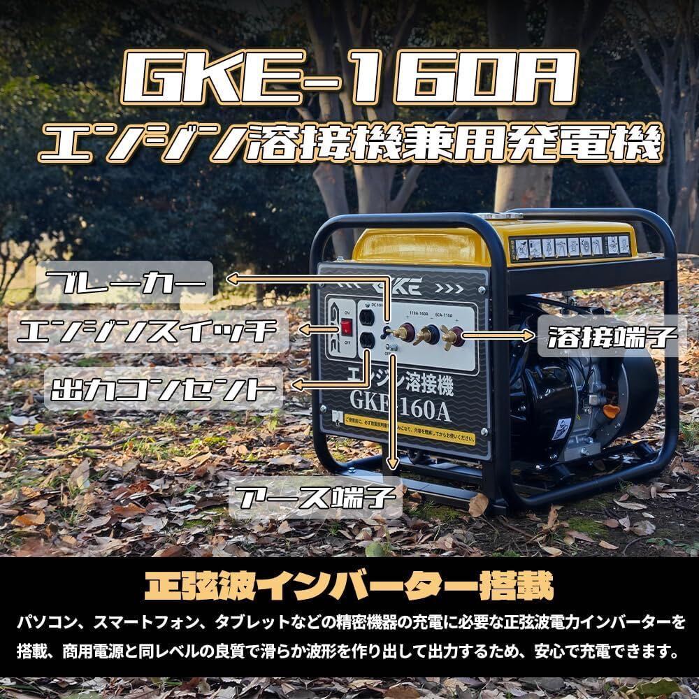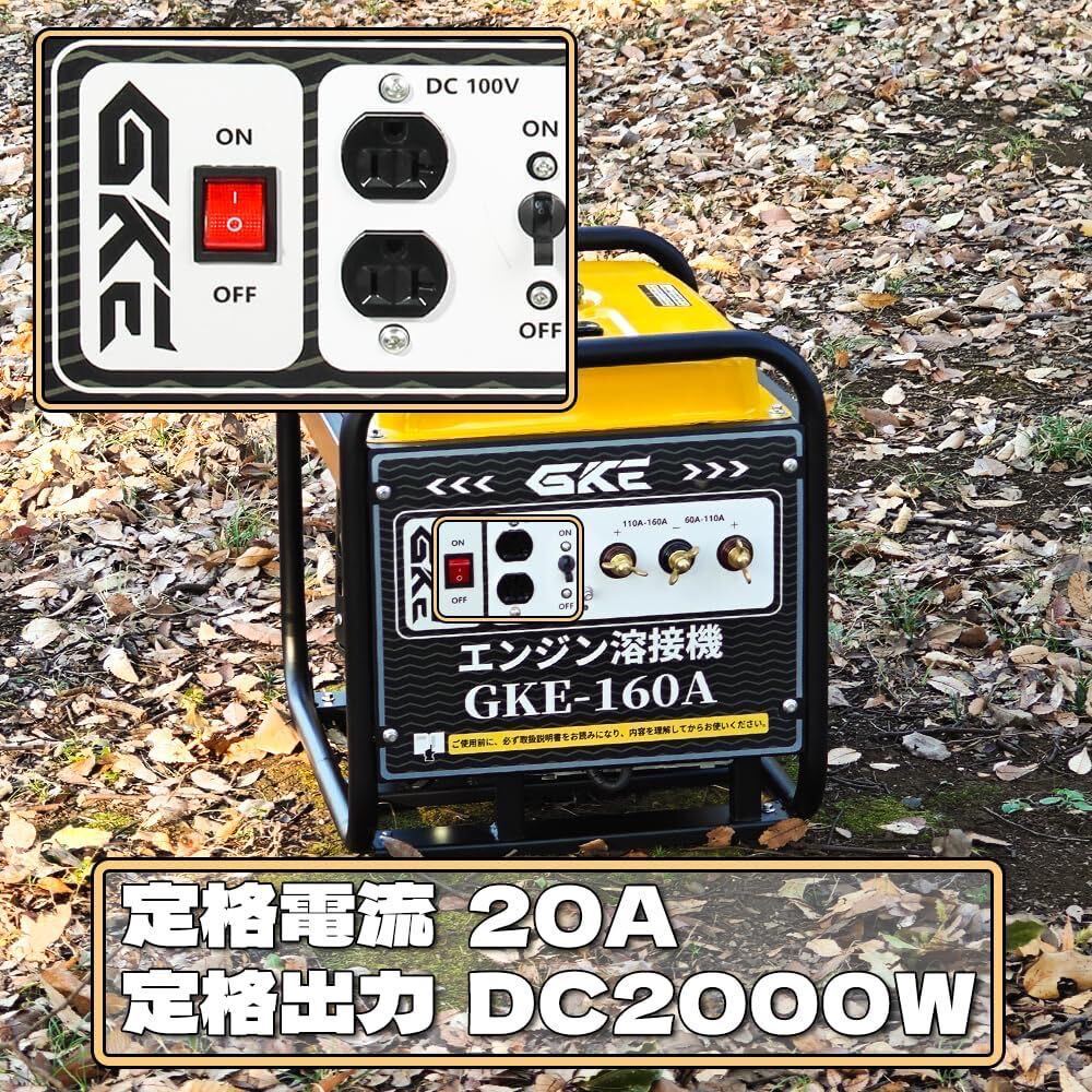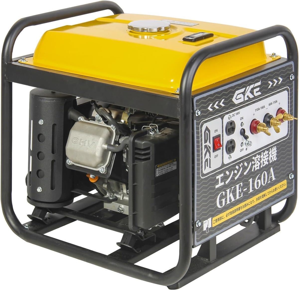 【詳細仕様】型番 GKE-160A 溶接手法:手動アーク溶接 直流溶接電源: 無負荷電圧:60-70V 定格負荷電圧:22-28V 定格出力電流:160A 電流調節範囲:60~110~160A 定格使用率:60% 適用溶接棒:2.5- 4.0mm 補助電源: 定格電圧、周波数:100V 定格電流:20A 定格出力:DC2000W 出力方法:連続 エンジン: エンジンモデル:175F 燃料タンク容量:12L エンジンオイル容量:0.7L 使用燃料:無鉛レギュラーガソリン エンジンオイル:SE級、SAE10W-30 排気量:252cc 点火システム:CDI