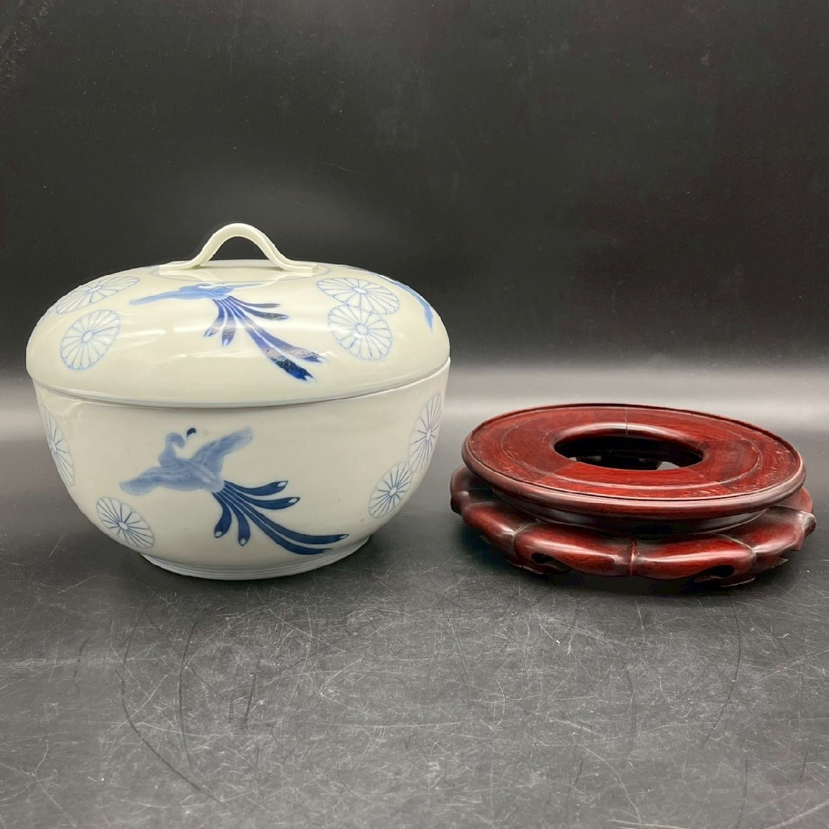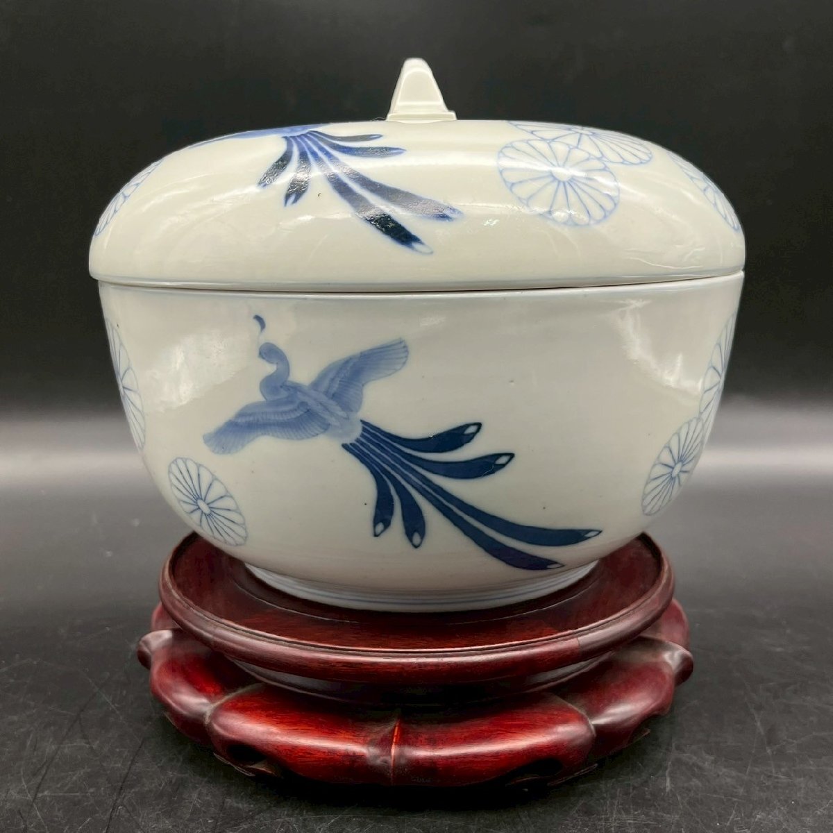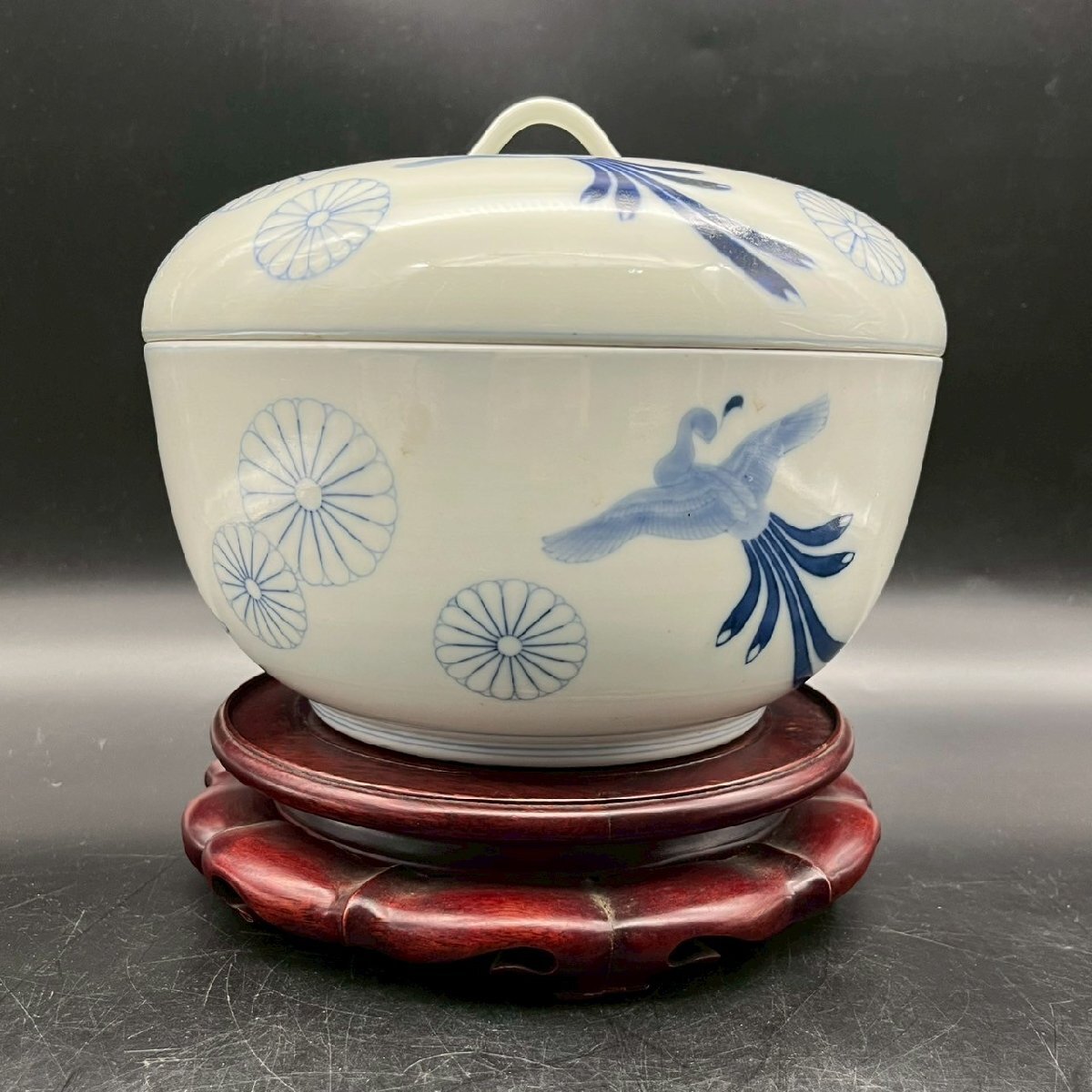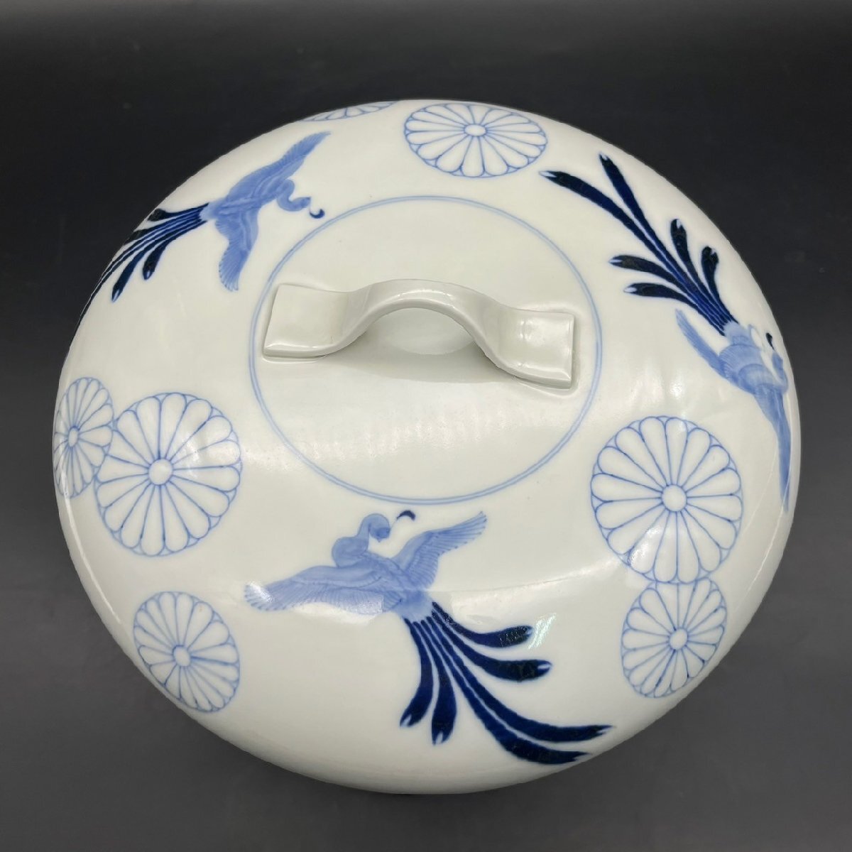 SW0429-6-3 茶碗 台付き 蓋付き お椀 食器 皿 鳥 花 前茶碗 陶器 陶芸 どんぶり 染付け 高さ18㎝ 直径23㎝ 台高さ5.5㎝ 直径21㎝ 100サイズ