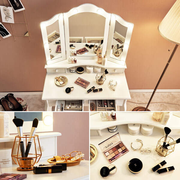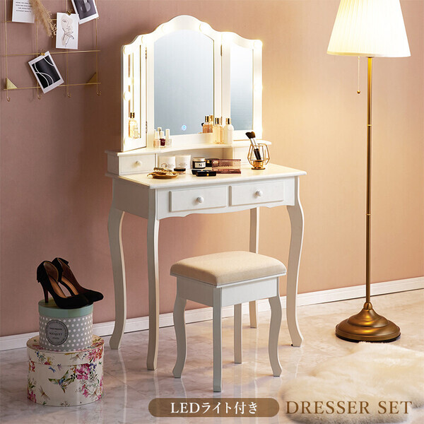 LEDの女優ライト付きのドレッサー。 いろいろな角度からメイクやヘアスタイルを確認できる三面鏡タイプ。 上品な曲線脚のデザインを合わせたスツール付き ■組立式 ■本体サイズ:ドレッサー:(約)幅75×奥行42×高さ138cm、スツール:(約)幅37×奥行28×高さ45cm ■素材・成分:主材:繊維板、張地:ポリエステル 着日指定をされる場合は、ご注文日の5日後から1か月以内での指定をお願い致します。 ************ 大型家具の場合 配送先地域によっては発送後8~10日ほどかかる場合があります ************ |