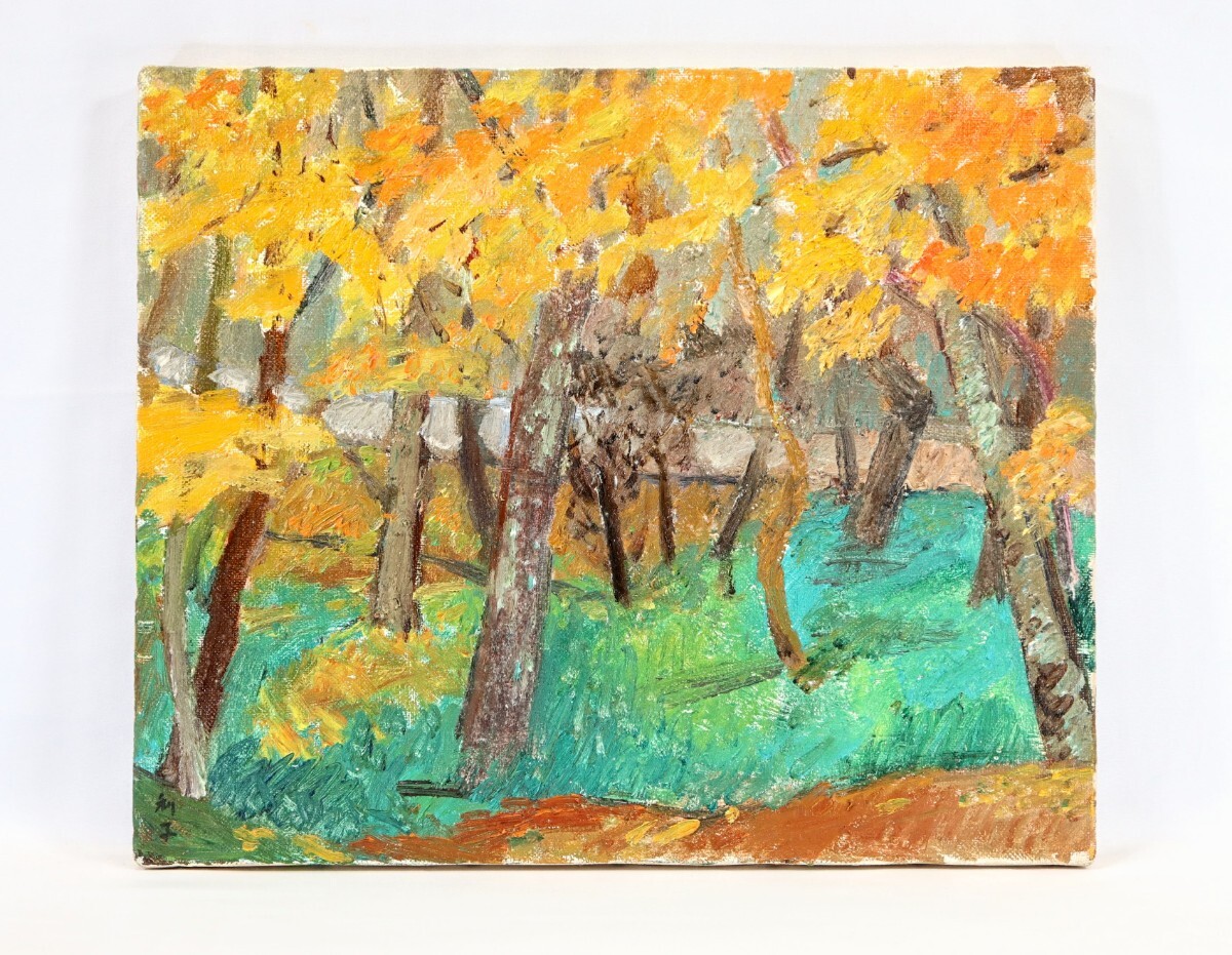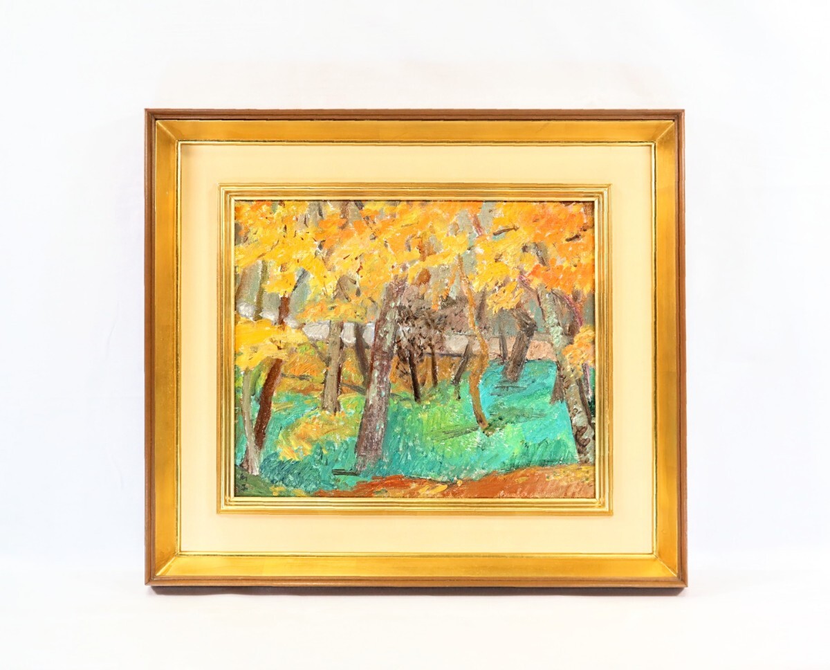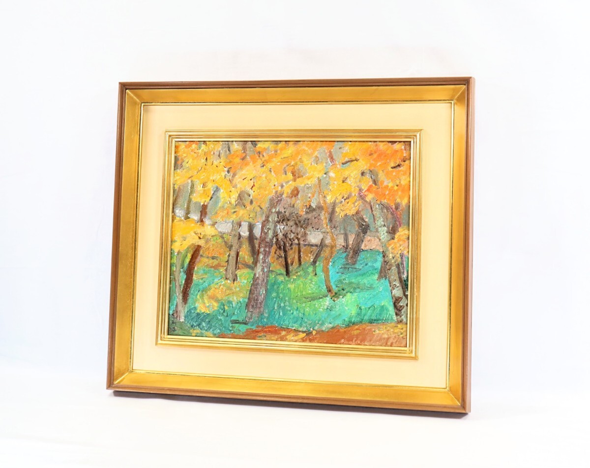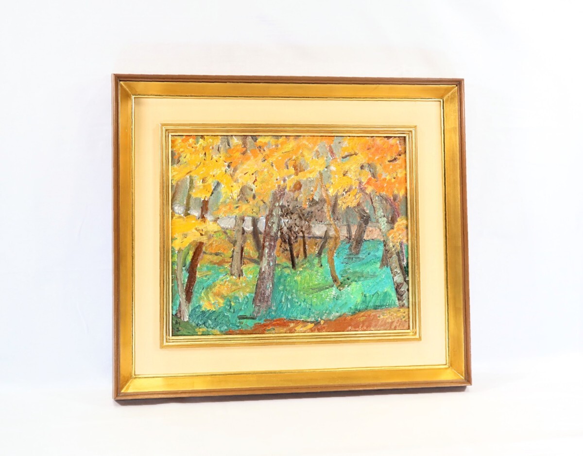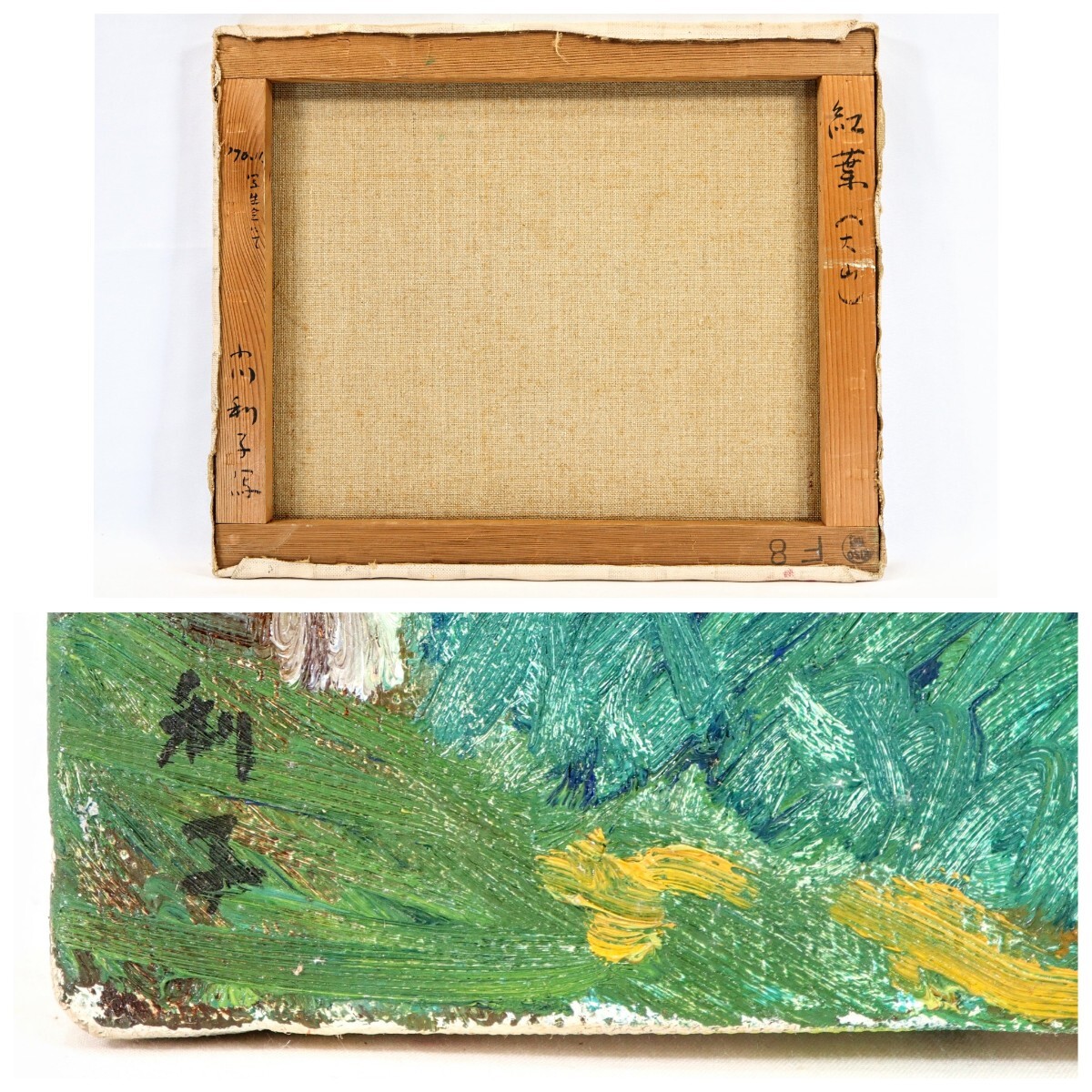 真作 小川利子 1980年油彩「紅葉 大山」画寸 F8 島根県出身 東光会 西日本屈指の美しさ誇る紅葉 秋の空気感や木漏れ日の温かさ伝わる 10820
