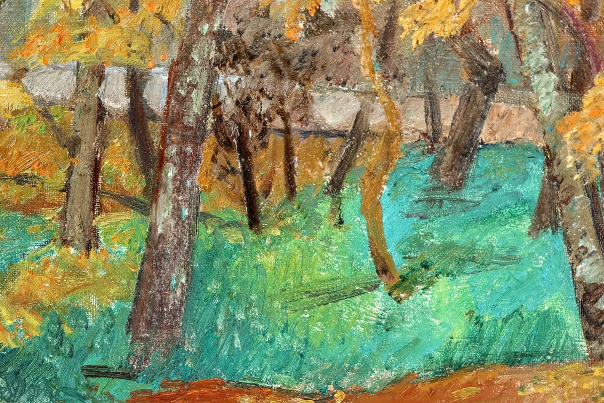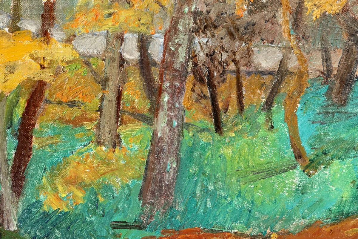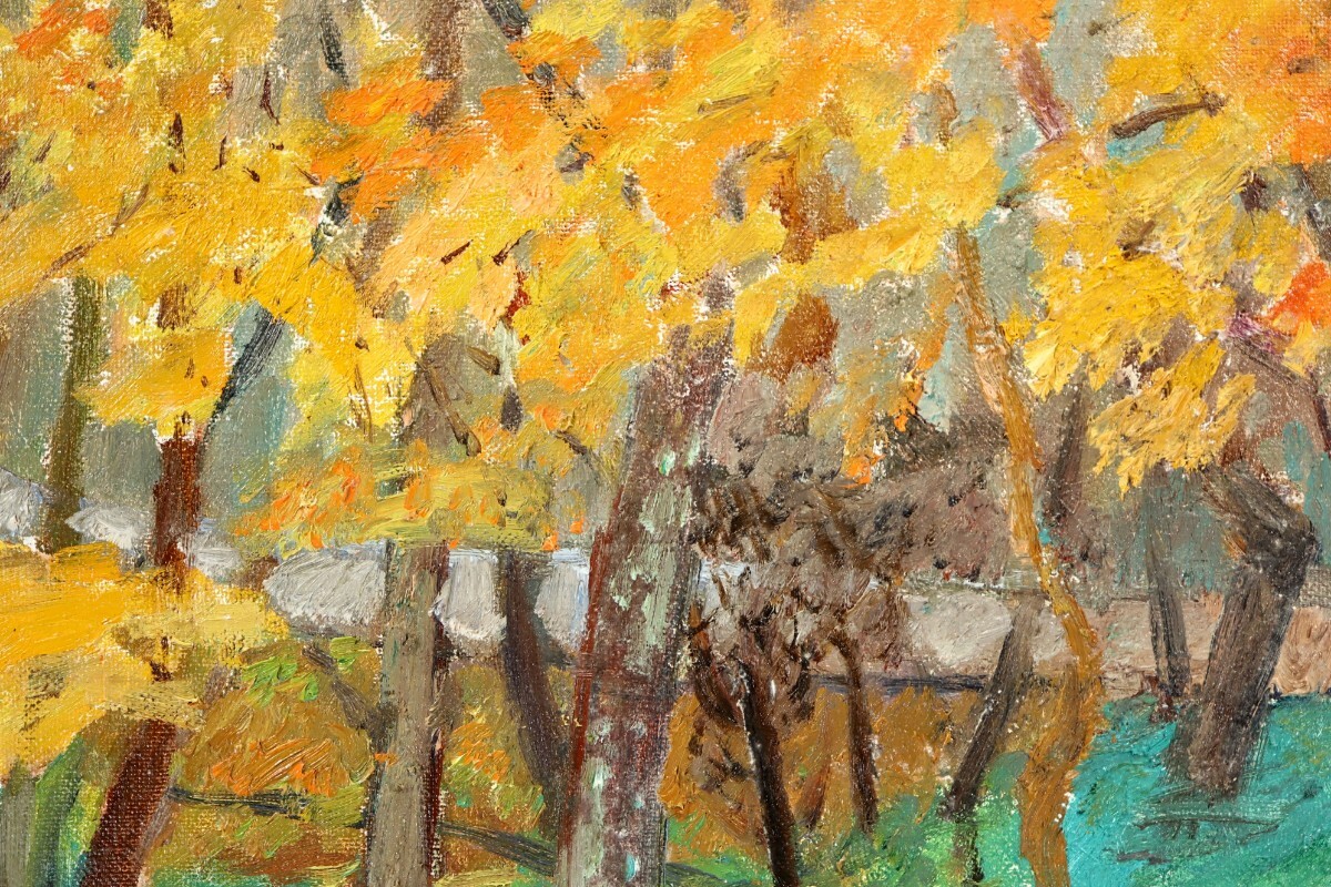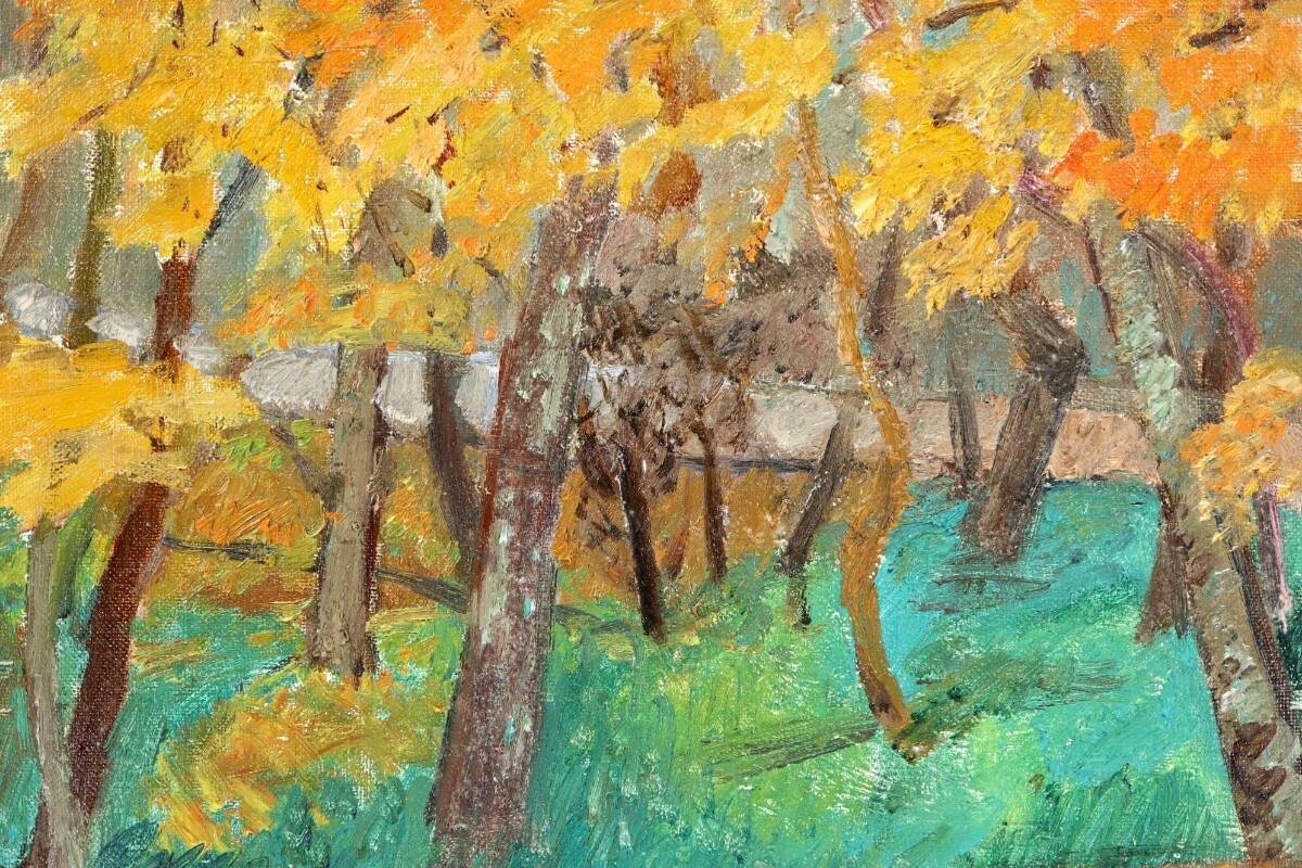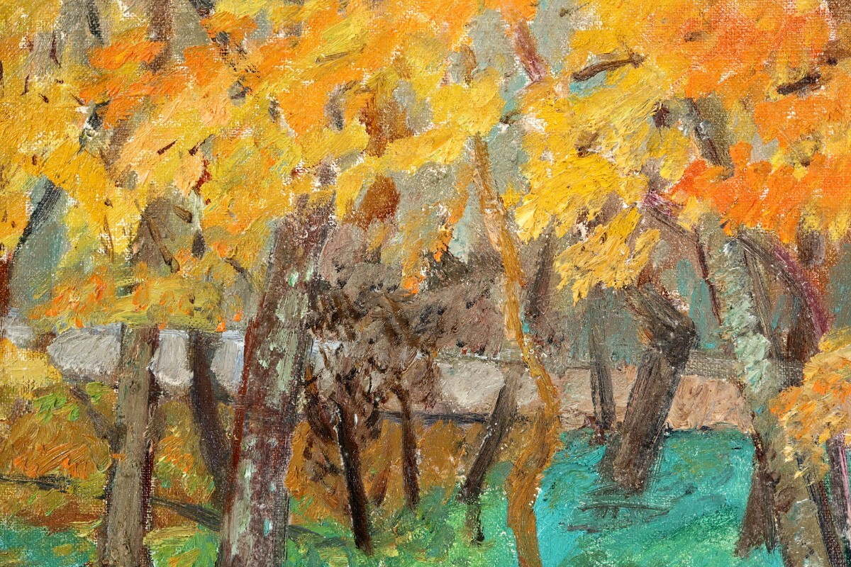 真作 小川利子 1980年油彩「紅葉 大山」画寸 F8 島根県出身 東光会 西日本屈指の美しさ誇る紅葉 秋の空気感や木漏れ日の温かさ伝わる 10820