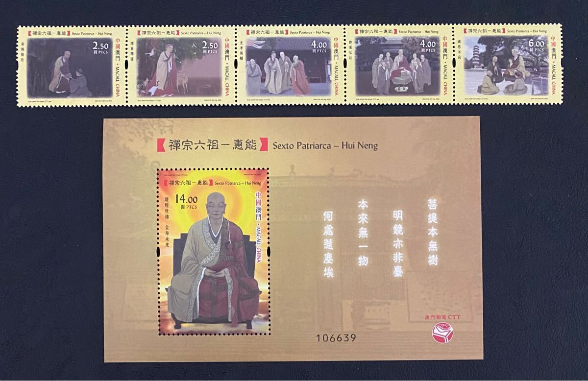 中国マカオ 六祖慧能 5種完 小型シート1種完 未使用 NHです。