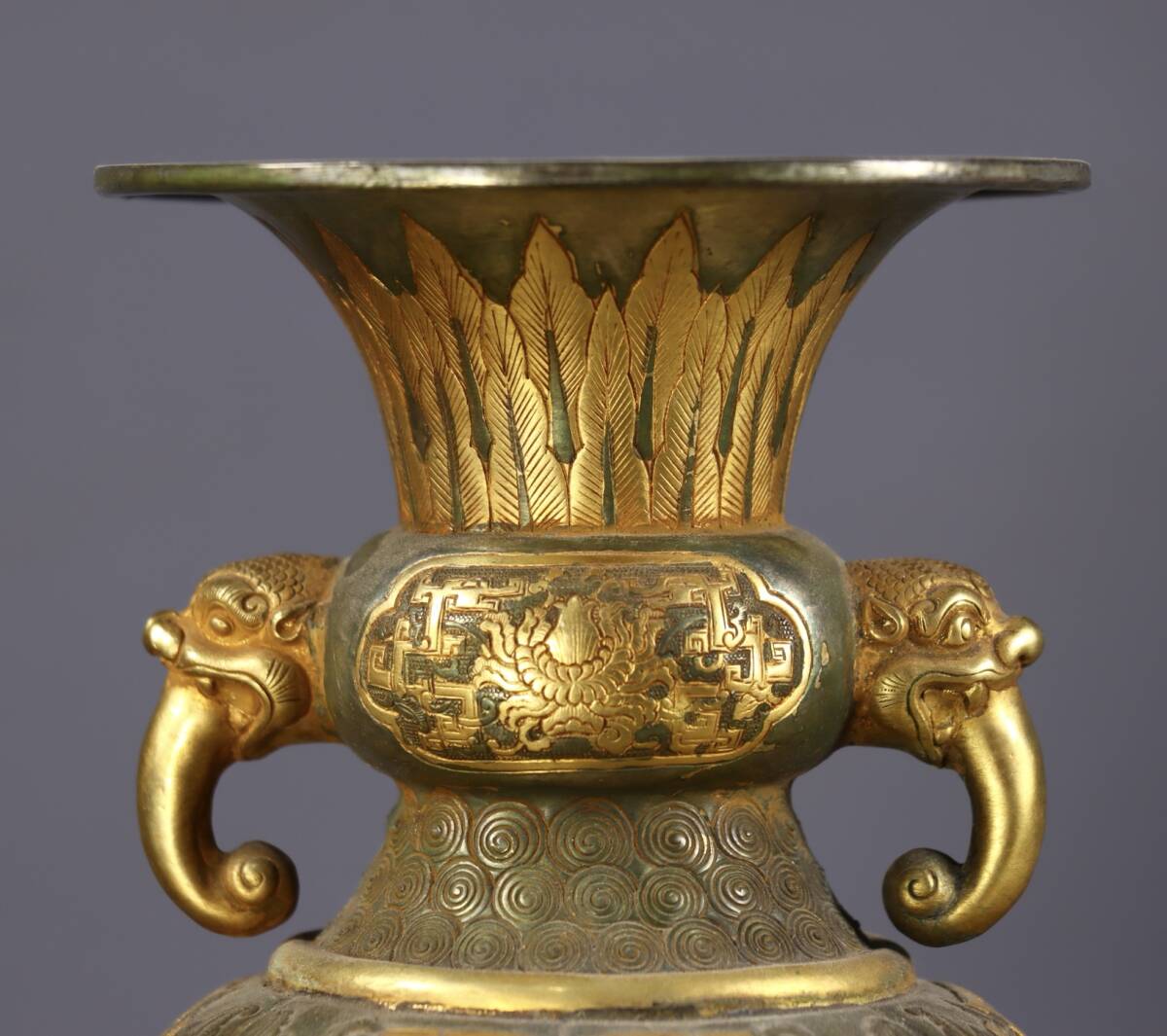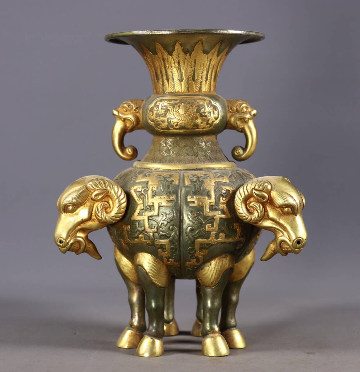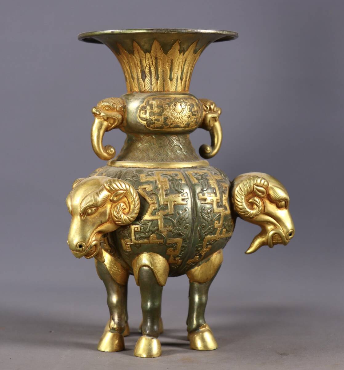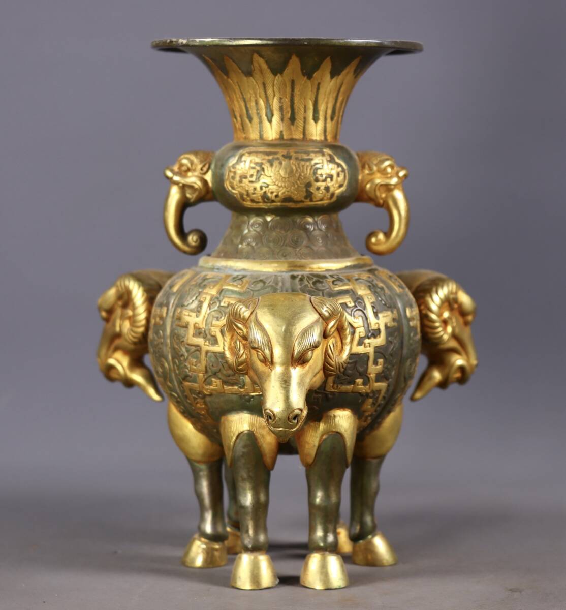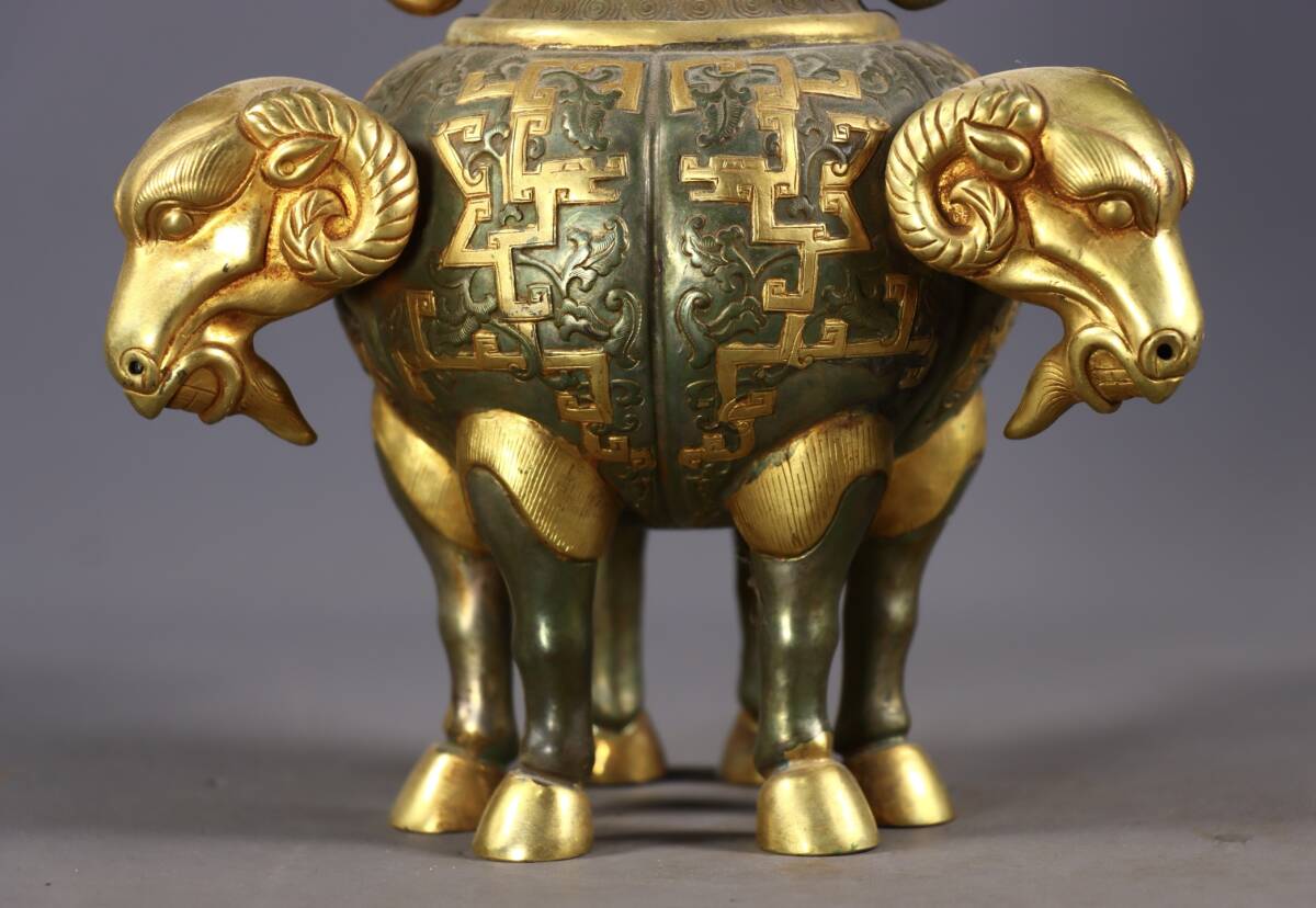 *珍品旧蔵* 清 局所塗金 高レリーフ鏨刻 三羊双耳瓶 銅製 極細工 唐物 中国古玩 骨董品 古美味 H45