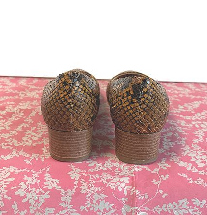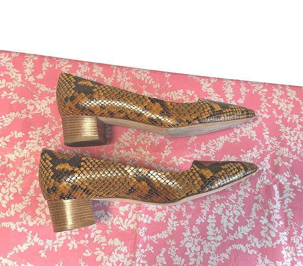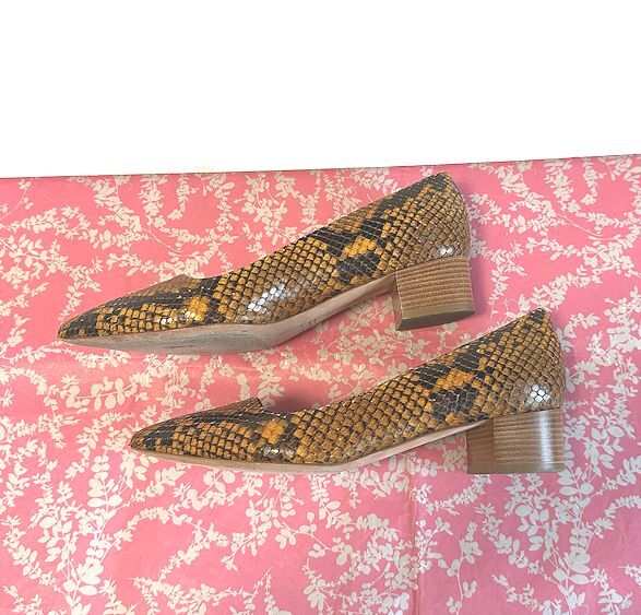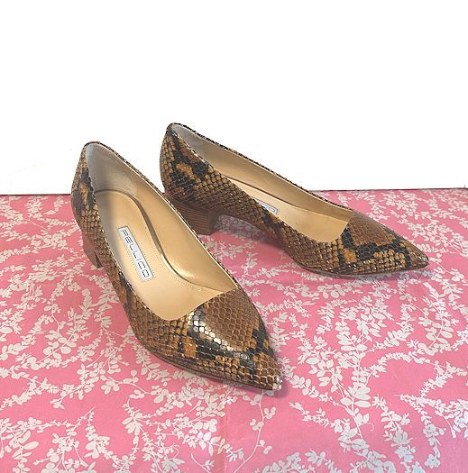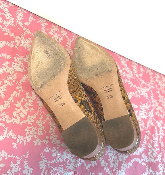 ◎“走れるパンプス”として人気を博した、PELLICOを代表する木型“ANDREA (アンドレア)”のパイソン・レザーを用いたローヒール・タイプ。つま先はシャープなシルエットでありながらも、やや広めのワイズと立体感のあるフォルムが特徴で、安定感も抜群です。アンドレアは大変気に入り、色、素材、ヒールの高さを変えて5足くらい購入して愛用しており、そのうちの一足です。通常、日本サイズ22.5~23.0cmを履いておりますが、ちょうどよい感じです。いかがでしょう★