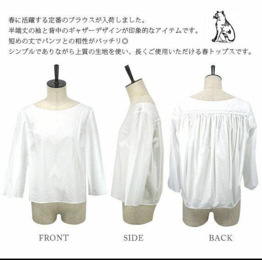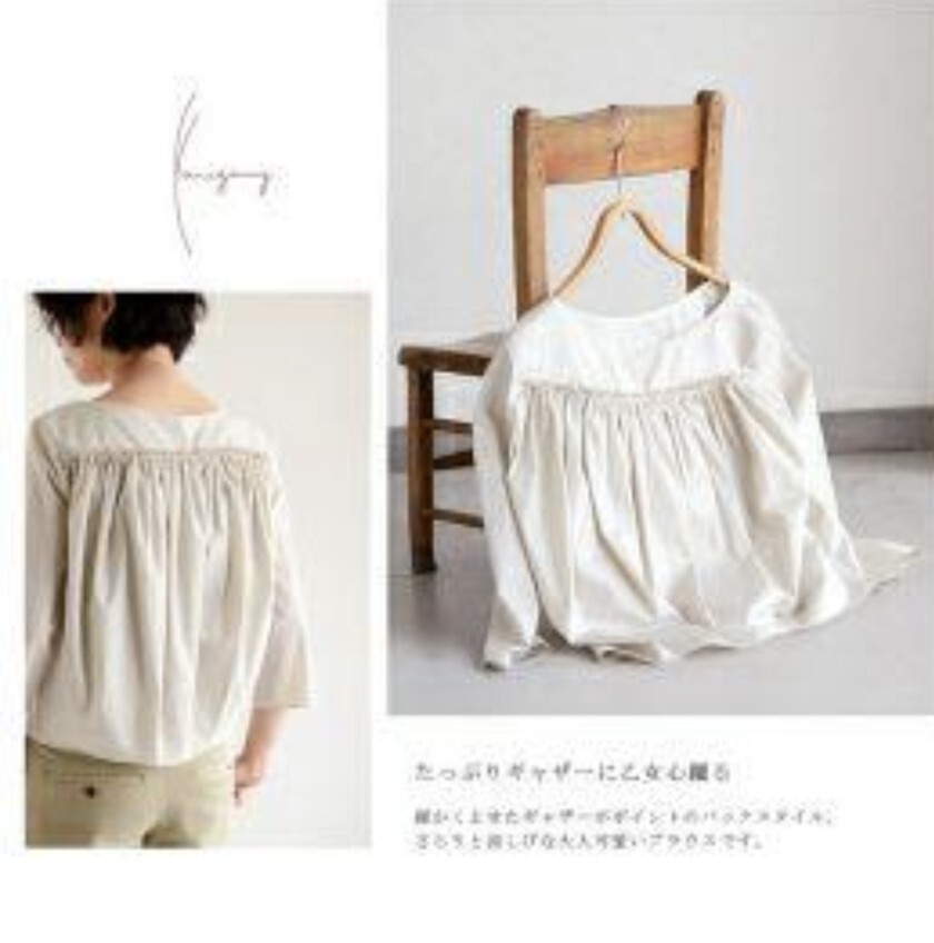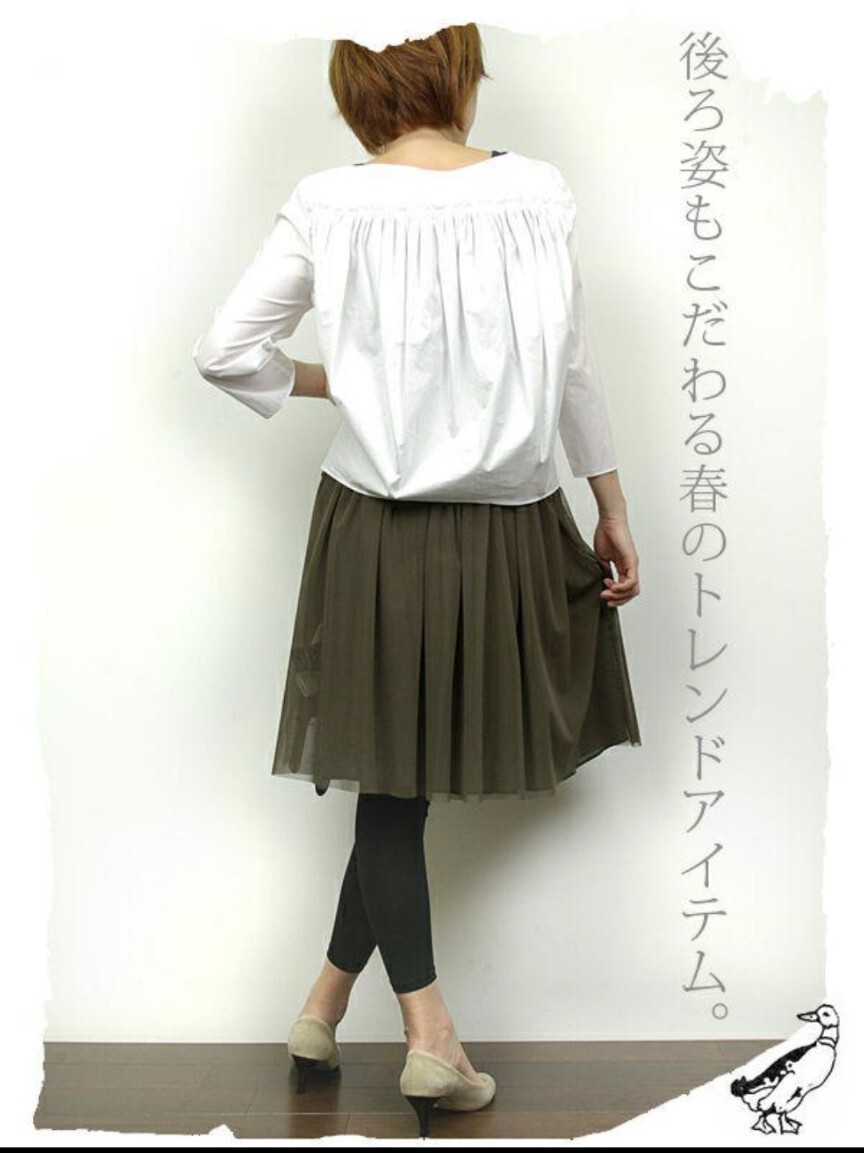 フロントはスッキリシンプルに、バックは可愛らしいデザイン。短めの8分丈の袖で手首もほっそりと見え、フレアーなシルエットで体型をカバーしてくれるのも嬉しいポイントです。パンツと合わせてもスカートと合わせてもフェミニンな要素をプラスしてくれる一枚です。