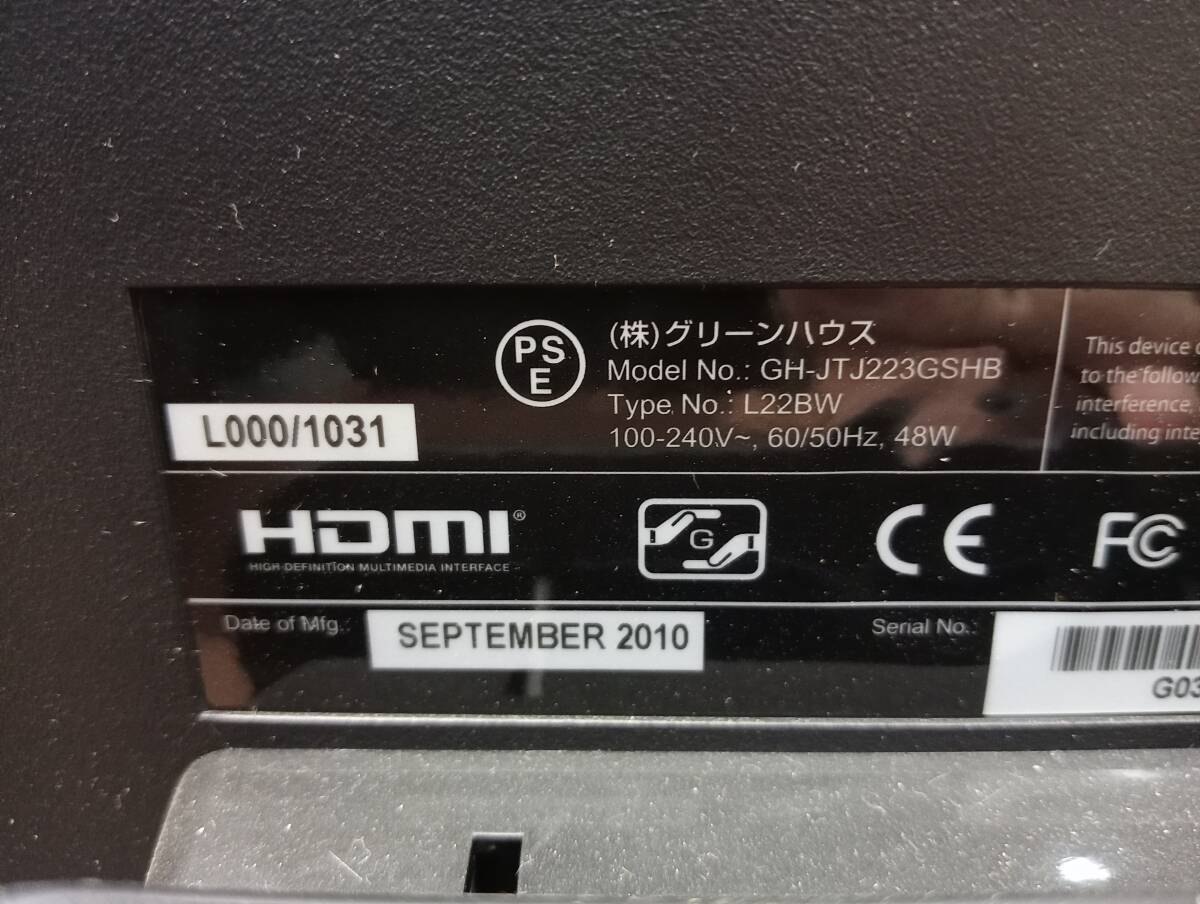 【YMT0930】★GREEN HOUSE GH-JTJ223GSHB タッチパネル液晶ディスプレイ 21.5インチ FullHD 表示確認のみ★中古