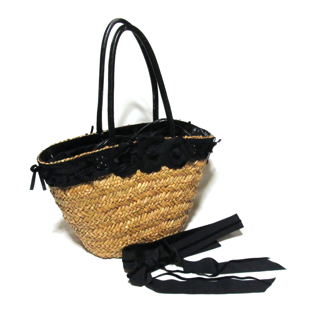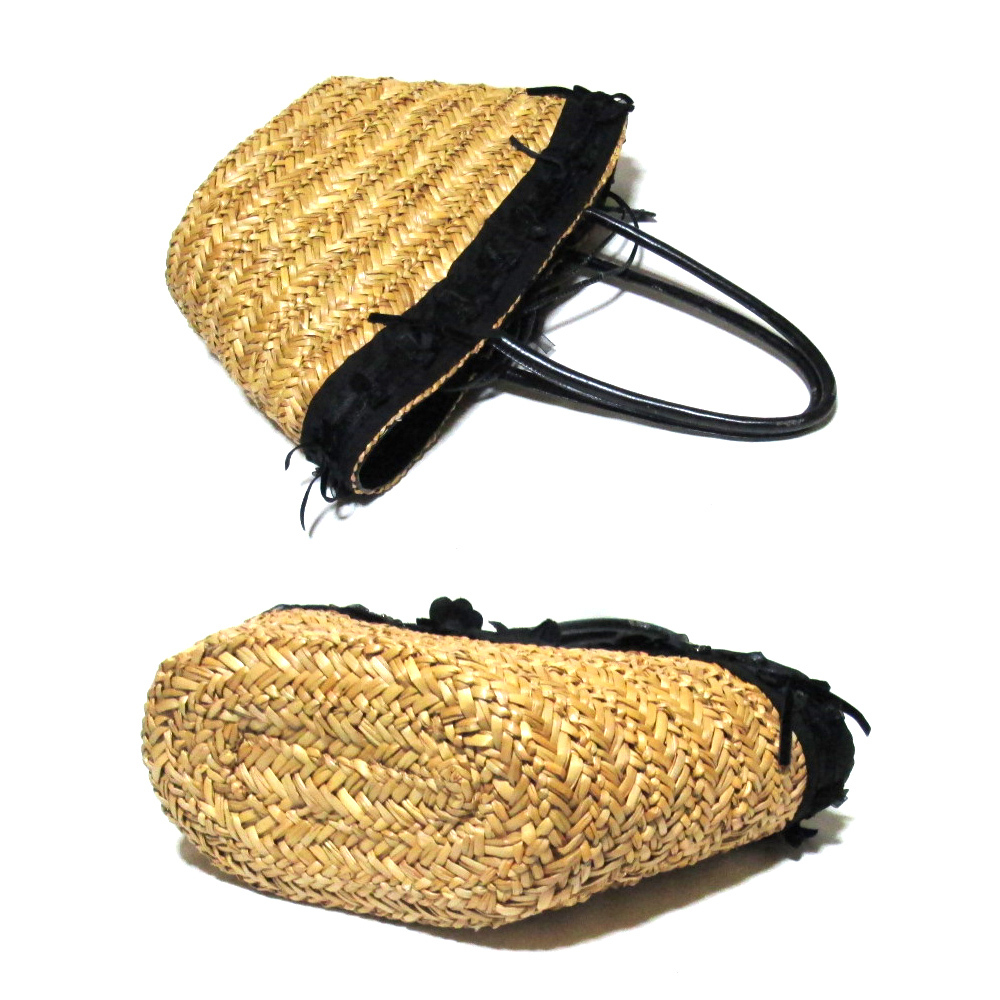 「夏の記憶を、そっと手に入れる。」Vintage INGEBORG(PINK HOUSE系列)|90s〜未使用に近い。かごバスケットトートバッグ&リボンベルト 2点セットです。繊細な編み目のバスケットトートと、フェミニンなリボンベルト。90年代のINGEBORGらしい、ナチュラルさとクラシカルな甘さを纏った2点セットです。トートは軽やかなカゴ素材に、リボン装飾があしらわれた愛らしい仕上がり。リボンベルトはワンピースやスカートに合わせて、スタイリングに華を添えます。 コンディション 本体は未使用に近い状態ですが、フェイクレザー部分に軽微な経年劣化が見られます。そのため、コンディションを考慮しかなりお得なプライスでご紹介しています。ヴィンテージならではの“今だけの出会い”を、ぜひ楽しんでください。
