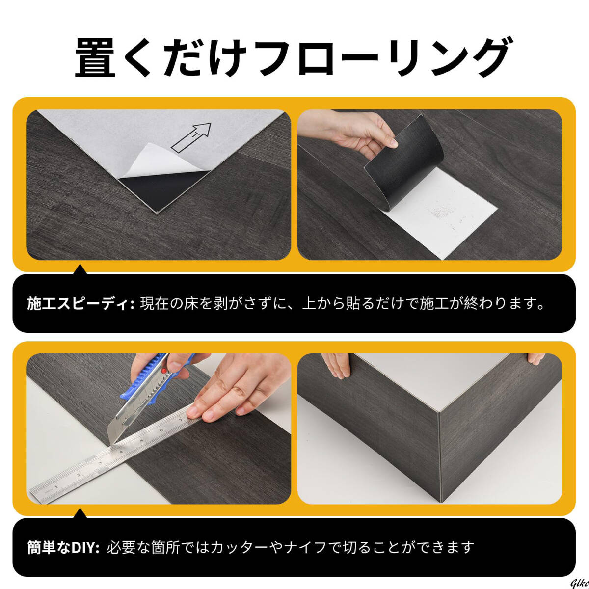 裏面が粘着式で接着剤が不要、シートを剥がして貼るだけで手軽にフローリングのリノベーションが可能です。