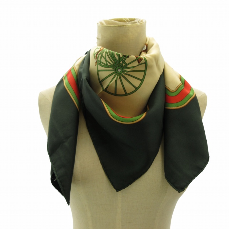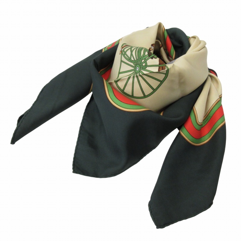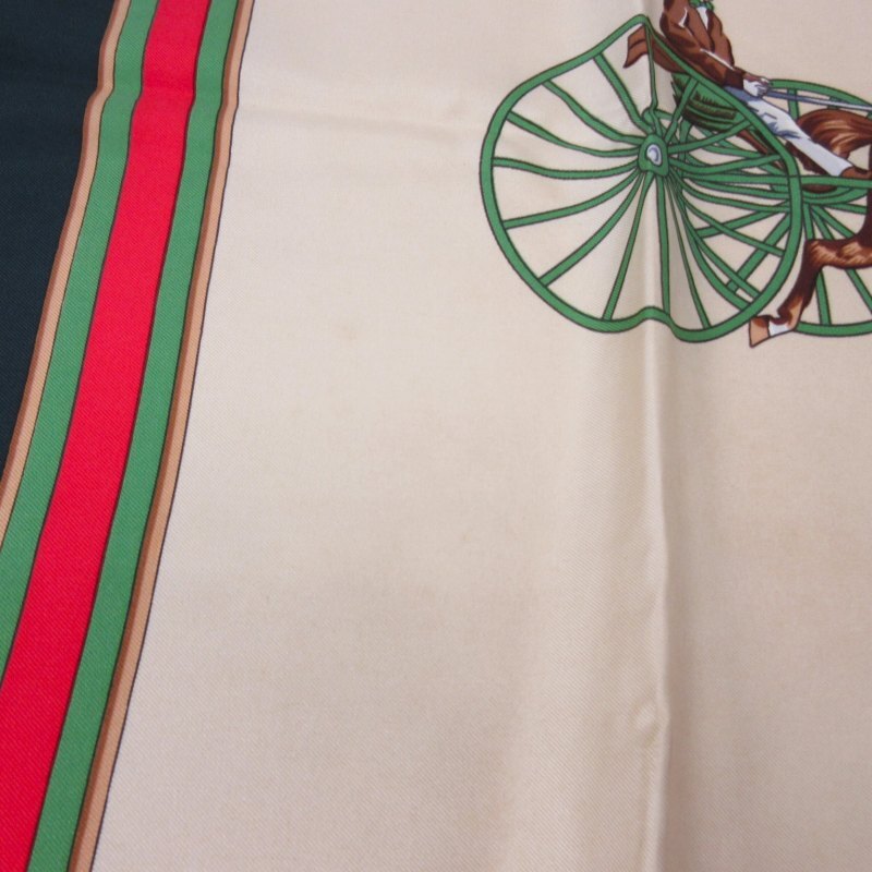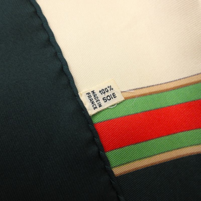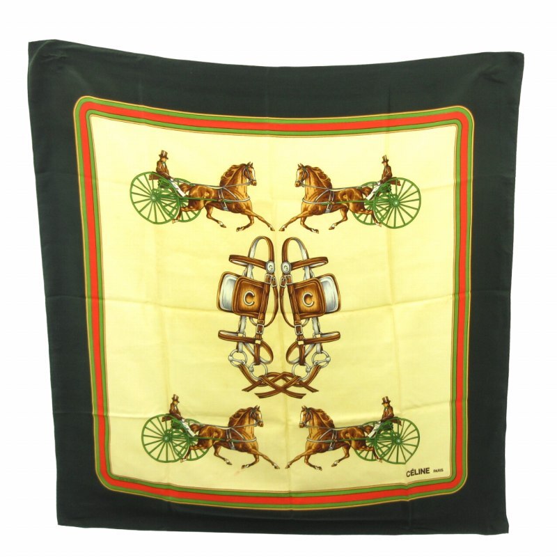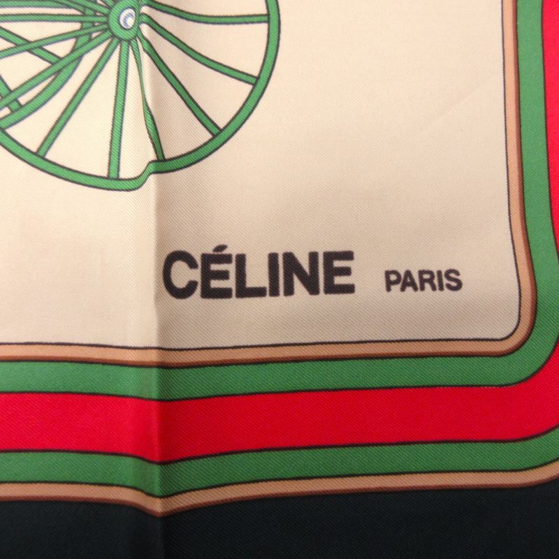 セリーヌ CELINE 馬車柄 シルク スカーフ 大判 総柄 フランス製 緑 グリーン ベージュ マルチカラー ■GY09 0502