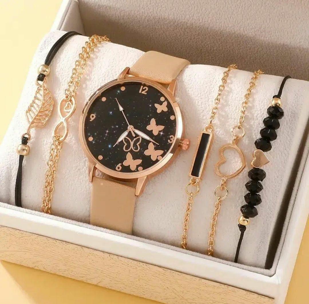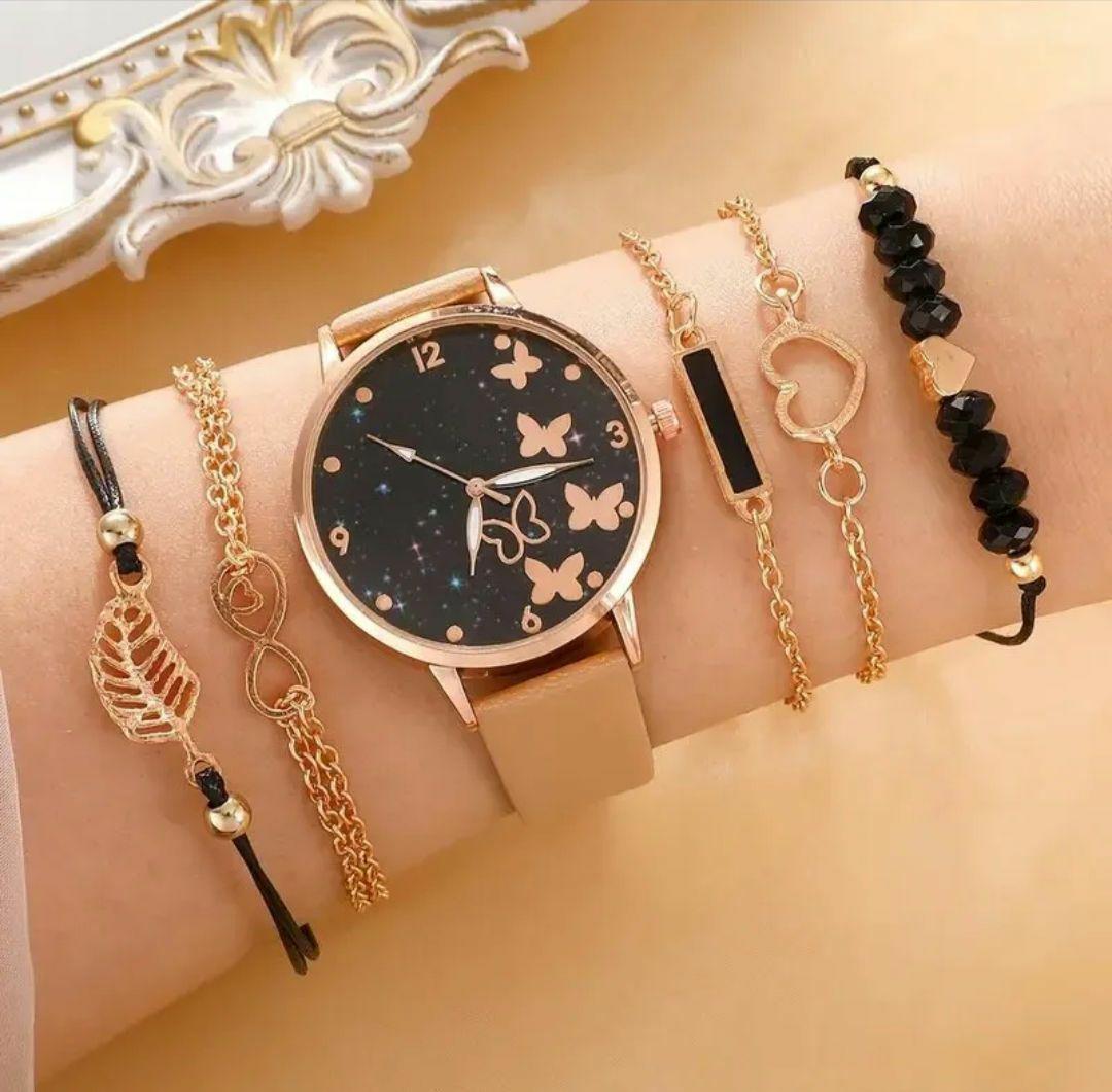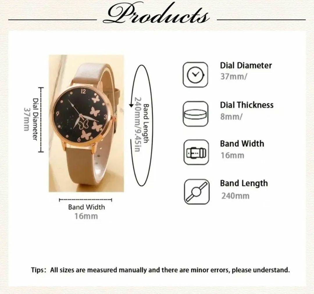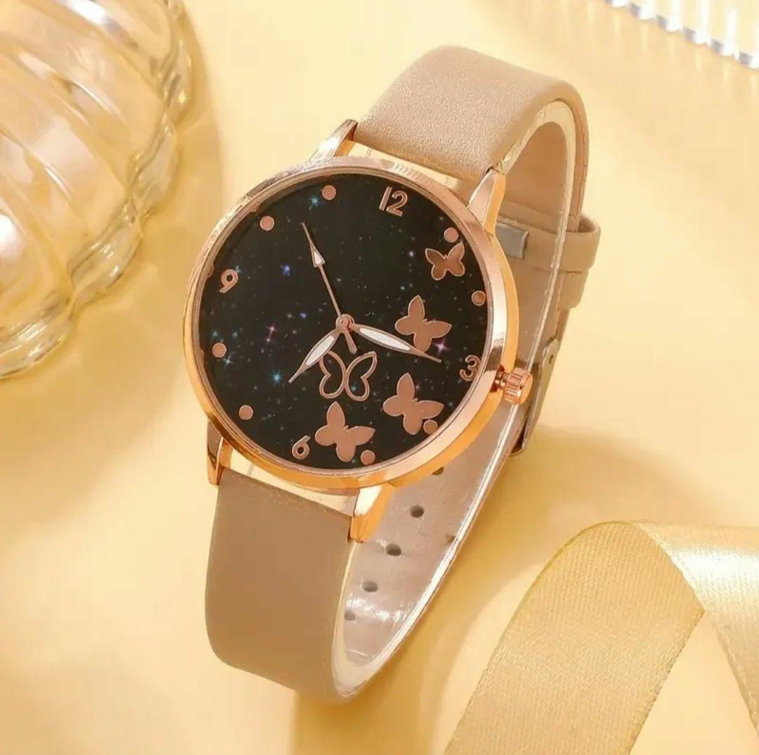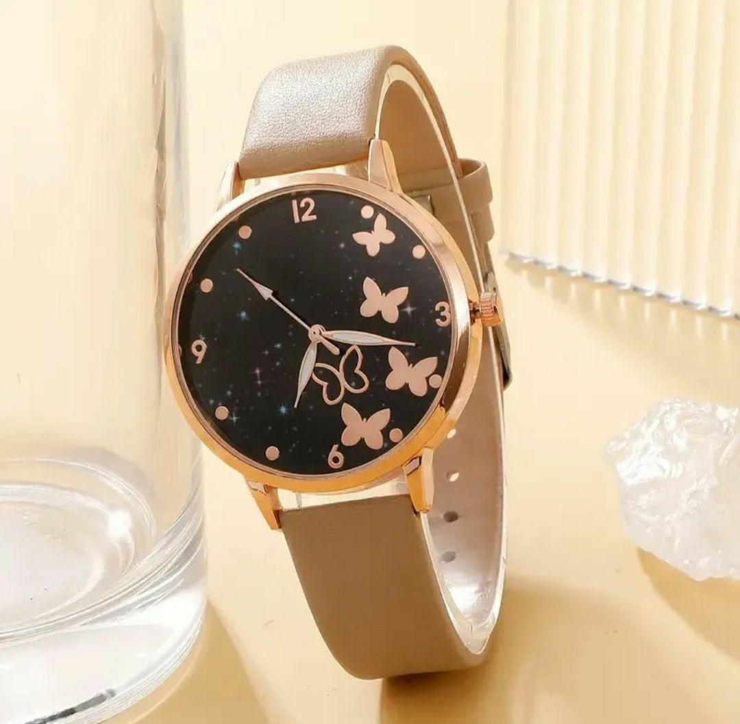 盤面は黒色を基調としたセットで、可愛い蝶がアクセントになった、年齢問わずどなたでもご使用していただけるデザインです。ベルトがベージュなので、ビジネスの場面でも違和感はないと思います。