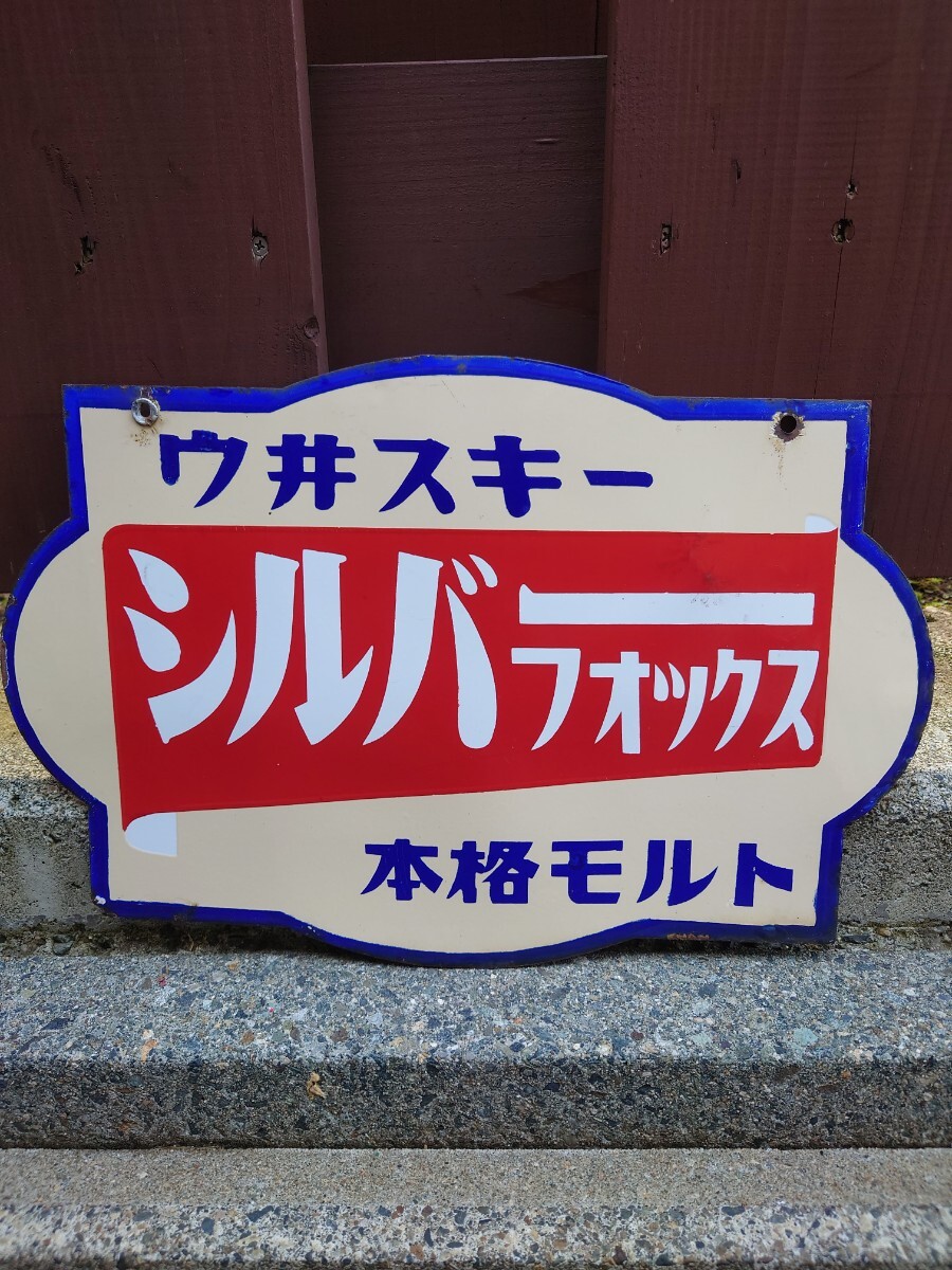 昭和時代の酒販店などで実際に使用されていた、「シルバーフォックス ウィスキー」のホーロー看板です。