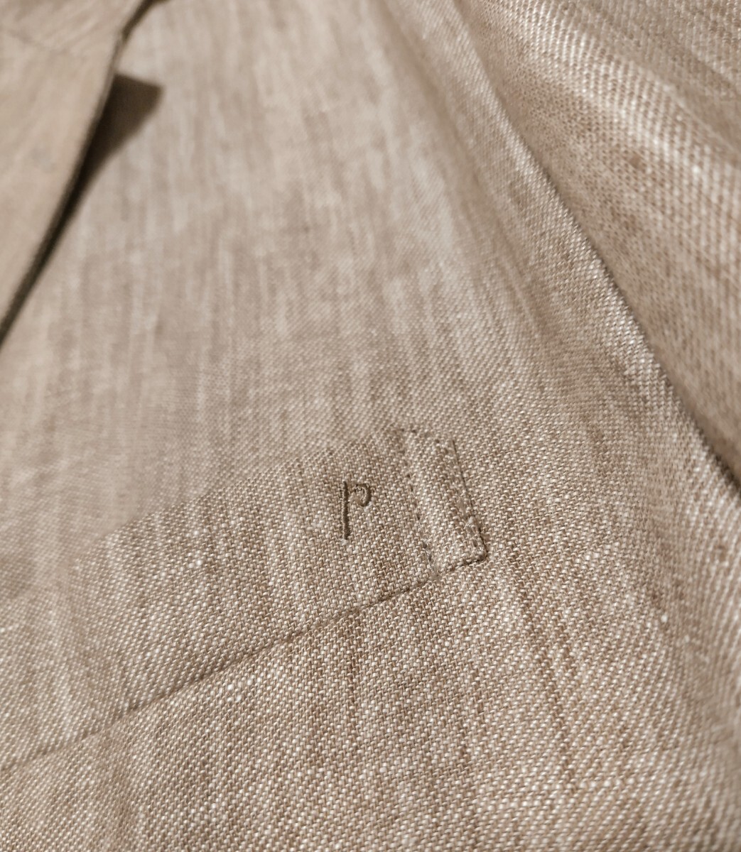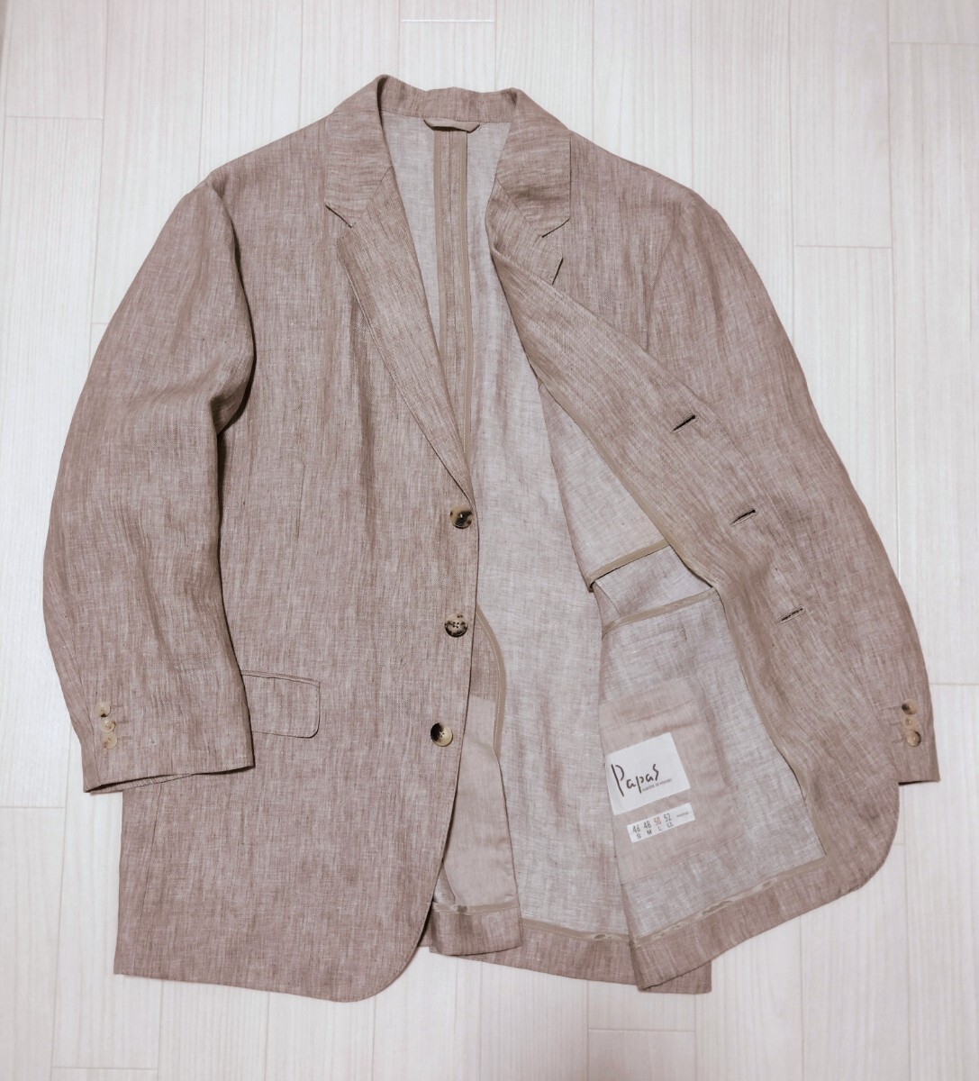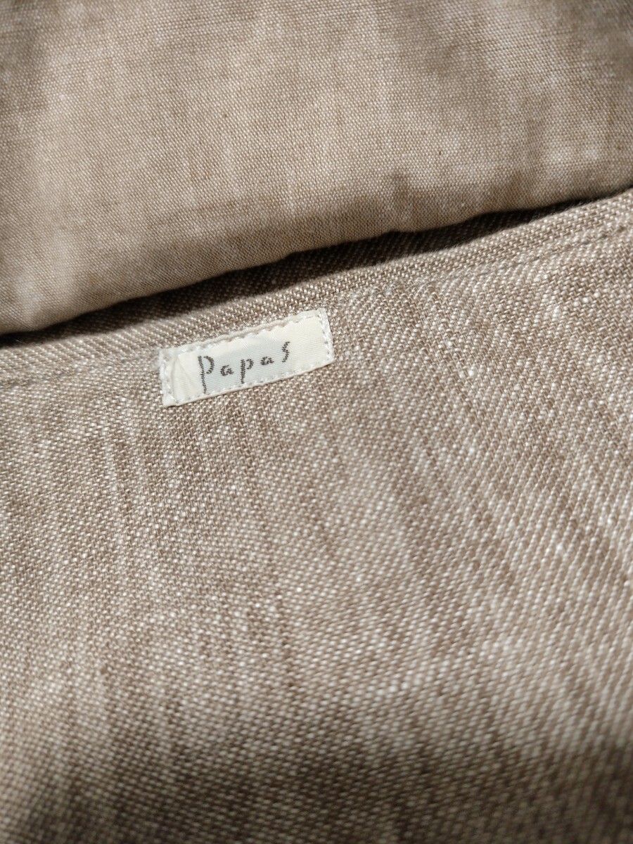 春夏に嬉しい風通しの良い麻を使用した、パパスの上品なテーラードジャケットです。胸ポケット部分の刺繍、右ポケットのフラップ部分のパッチなど、シンプルでありながらブランドの主張も織り込まれています。