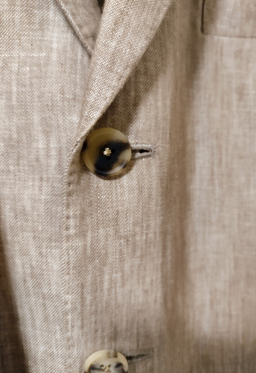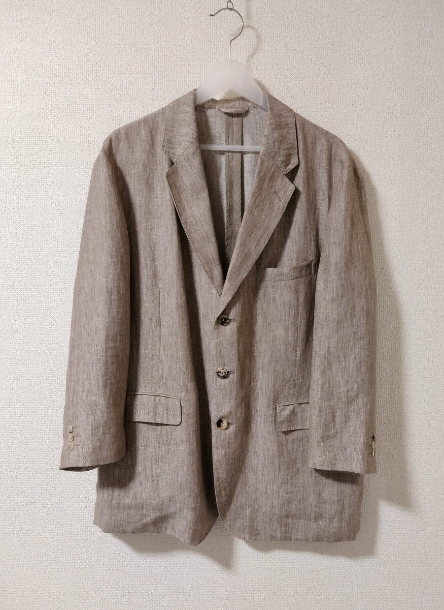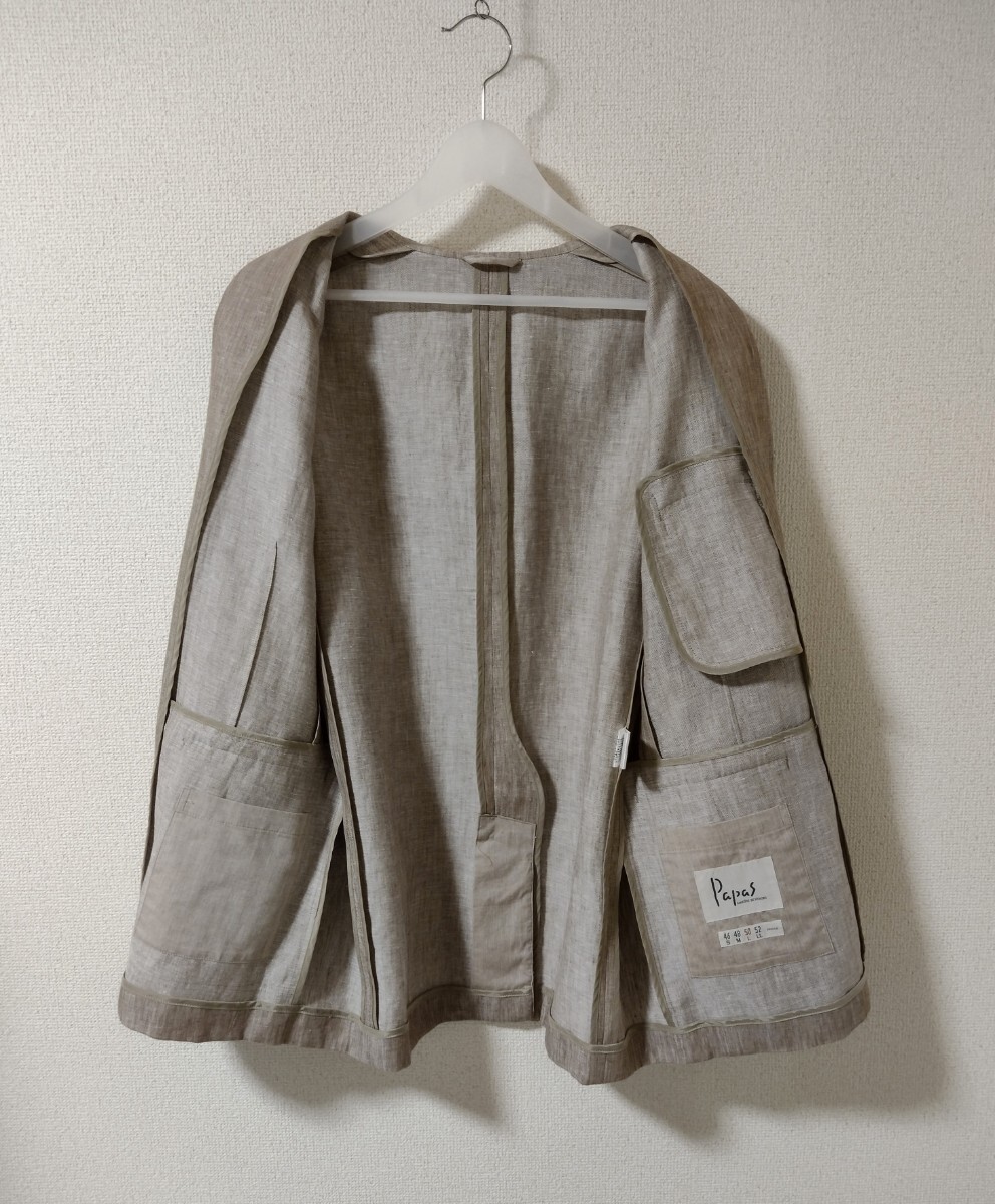 春夏に嬉しい風通しの良い麻を使用した、パパスの上品なテーラードジャケットです。胸ポケット部分の刺繍、右ポケットのフラップ部分のパッチなど、シンプルでありながらブランドの主張も織り込まれています。