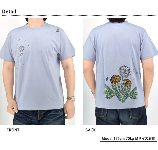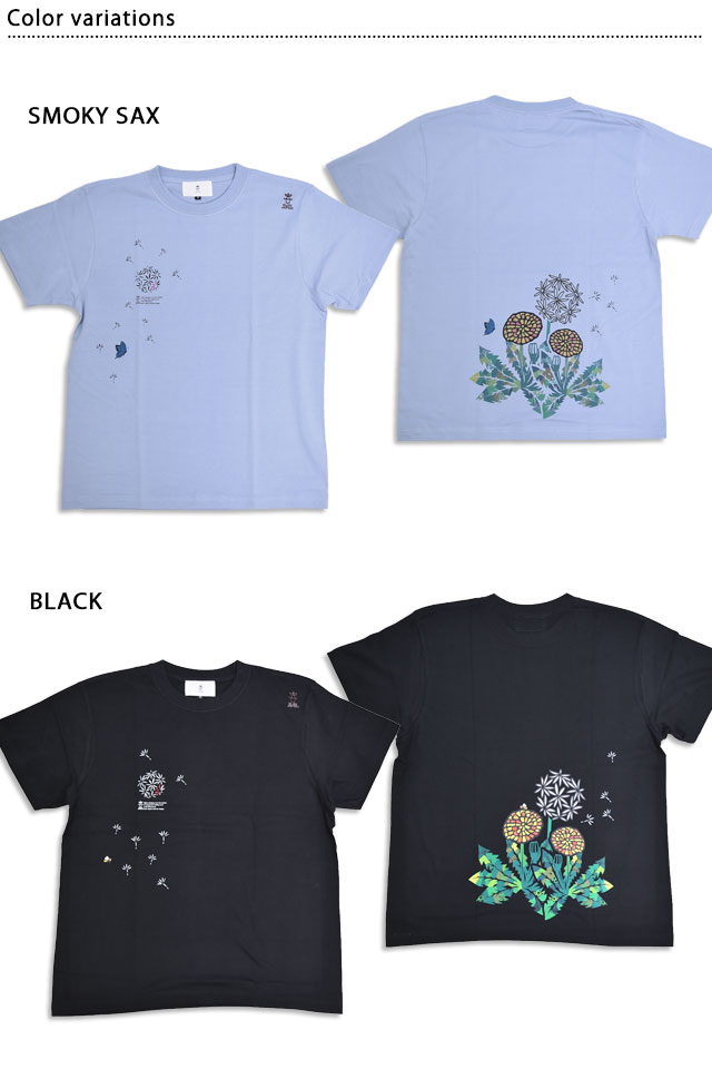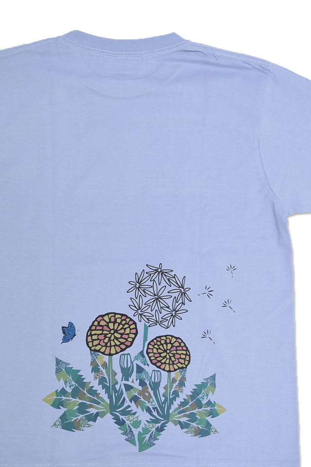 着た人、それを見た人が笑顔になれる、他にはないデザインを提供し続けている「喜人」さんから「たんぽぽ半袖Tシャツ(KJ-52006)」のご紹介です。 いつもの通り道に、ふと気づくと咲いているタンポポ。 もうそんなに暖かくなったのか、と春の訪れを伝えてくれます。 可愛らしい花を咲かせて、最後は綿毛をつけ、子供たちが息を吹きかけて散っていく、そんなささやかで素敵なタンポポを落とし込みました。 デザインは敢えてステンドグラス、切り絵のような雰囲気で表現し、バックに華やかな花を、フロントに向かって綿毛が舞い上がり散っていくような構成に。 また、カラーによって綿毛の散り方を変えるギミックもプラス。 さらに、ホワイトはテントウムシ、サックスには蝶々、ブラックにはミツバチさんと、ボディーカラーによって異なるムシさんが描かれています。 こちらのTシャツで春を感じちゃってください。 | ||||||||||||||||||||