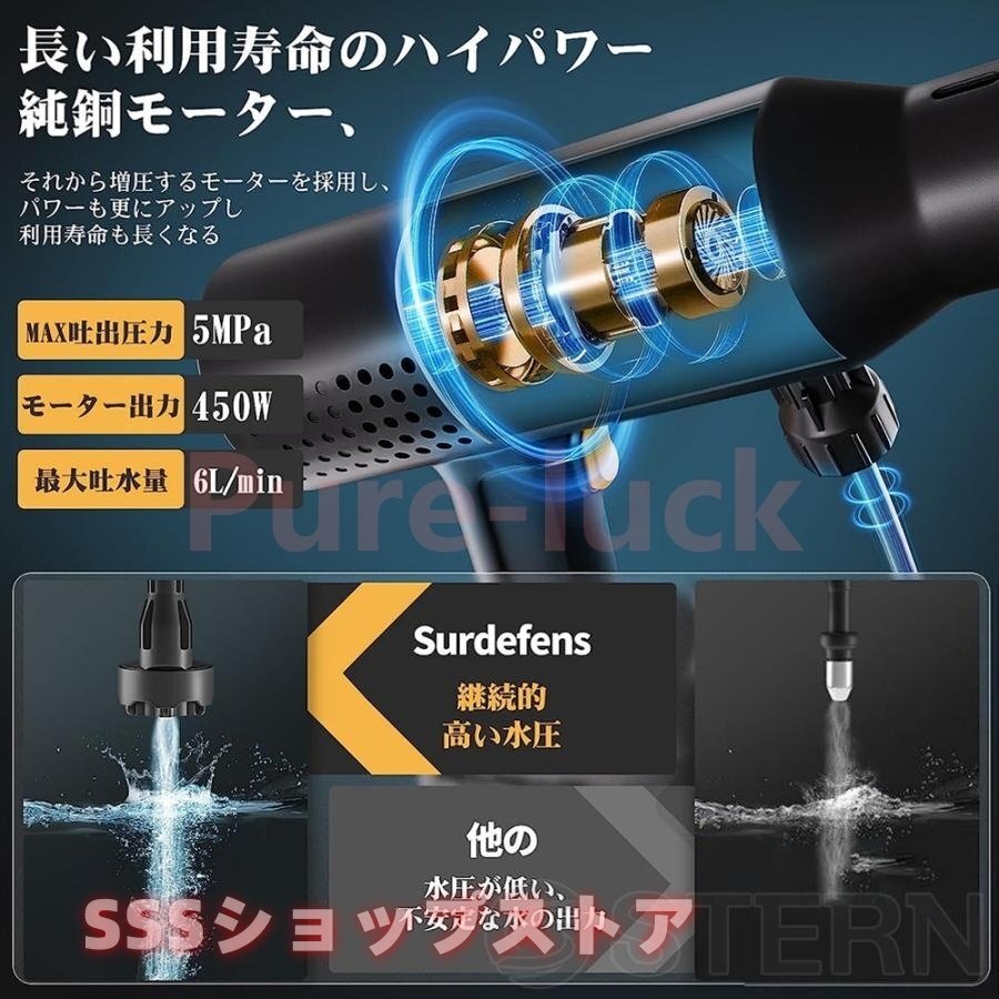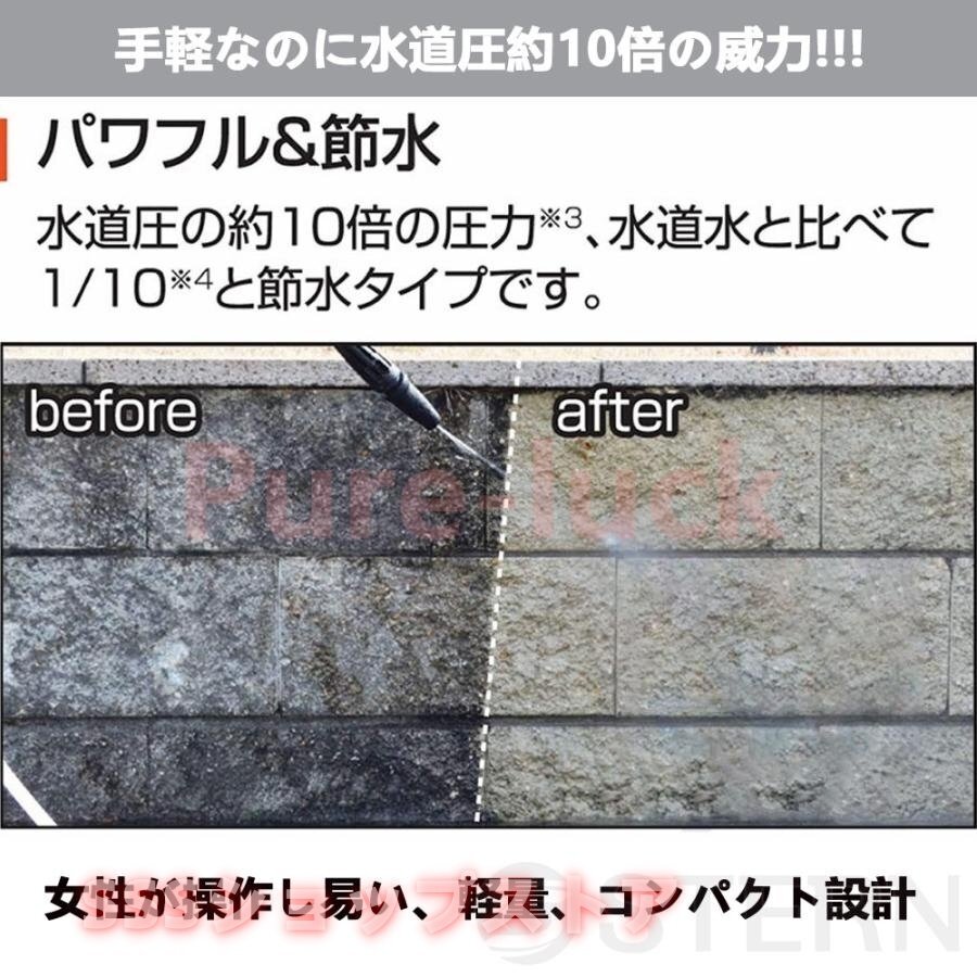【高性能ハイパワー】家庭用洗浄機は高性能なパワーモーターを搭載して、水を素早く吸入・加圧して噴射します。吐出圧力8.0Mpaで噴射される水流により、ガンコな汚れを洗い流す高圧洗浄機です。