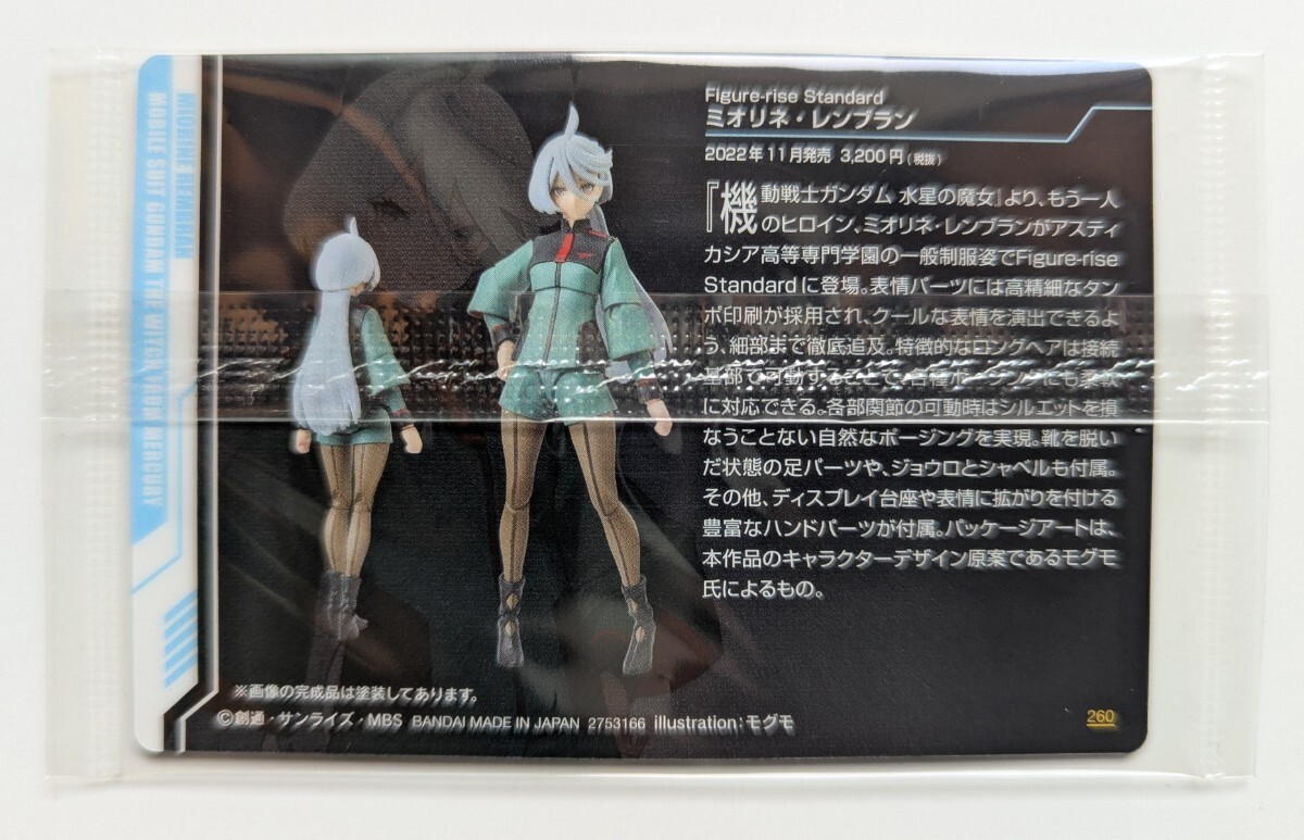 GUNDAMガンプラパッケージアートグミ カード「260 ミオリネ・レンブラン 水星の魔女 1枚」未開封品になります。状態は良好だと思いますが、神経質な方は入札をご遠慮ください。ご理解頂ける方のみご入札お願いします。厚紙で補強して発送します。発送方法は、普通郵便(厚さ1cm以内)、レターパックライト(送料430円)、レターパックプラス(送料600円)、の中からお選びください。(※代金引換は対応しておりません。)素早くお取引を行える方を希望致します。オークション終了後、5日以内に入金できる方のみご入札お願いします。落札後のキャンセルはお断りします。評価の悪い方や、連絡が遅い方は入札をご遠慮ください。落札後はノークレーム、ノーリターンでお願いします。