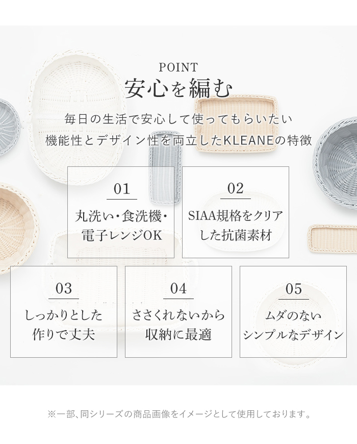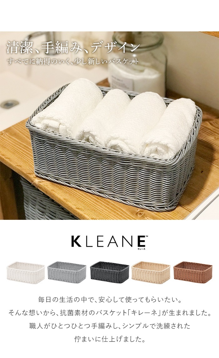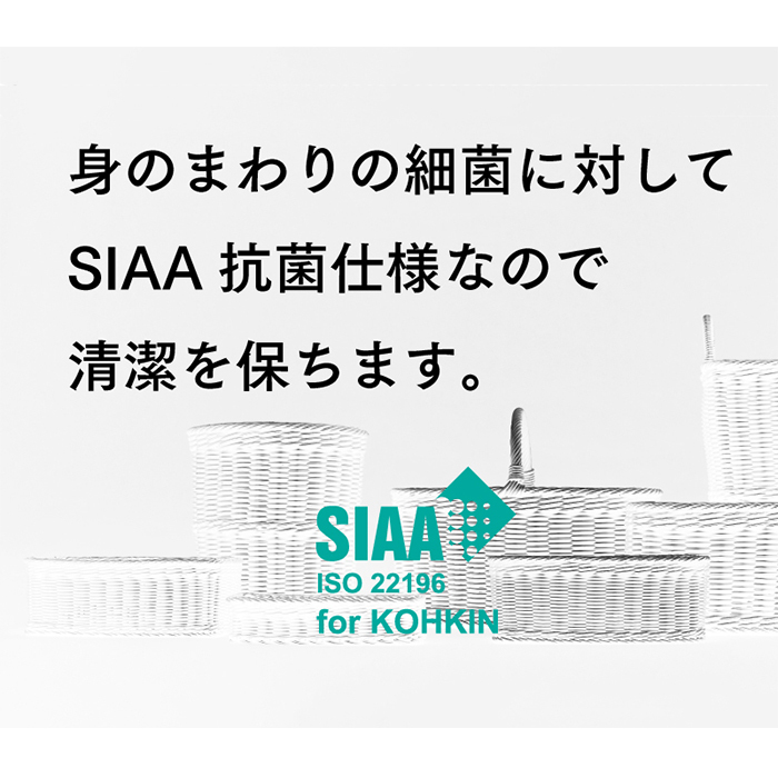 | 見た目は籐のかごですが、実は抗菌樹脂製バスケット。 「抗菌性・安全性・適正な表示」を保障する「SIAAマーク」の表示が認められた、SIAA規格をクリアした抗菌素材(PP・PE配合)を使用、製品の表面上における細菌の増殖を抑制。 樹脂製なので、天然素材のようなささくれなどがなく、タオルや衣類なども炒める心配がないので、どんな収納にも最適。 紫外線にも強く、劣化も怒りにくく耐久性にも優れています。 水や湿気に強く、丸洗いできるので、水周りの収納やレジャーにもおすすめ。 汚れが気になっても手軽に水洗いできるので、いつでも清潔に保つことができます。 食洗機、電子レンジの使用も可能です。 ※ハンドメイトの商品の為、一つ一つ個体差があり表記サイズと異なる場合がございます。 |