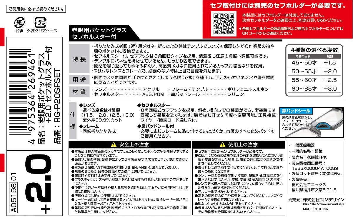 タジマ tajima 老眼用ポケットグラス+2.0 セフホルスター付 品番:RG-P20SFSET |