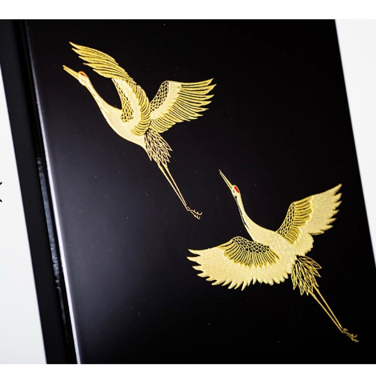 うるし塗を用いた蓋の表面には金色のつがいの鶴が蒔絵で描かれています。熟練した職人たちによって、ひとつひとつ精魂こめて丹念に作り上げられ、独特の味わいと気品高さが際立っています。