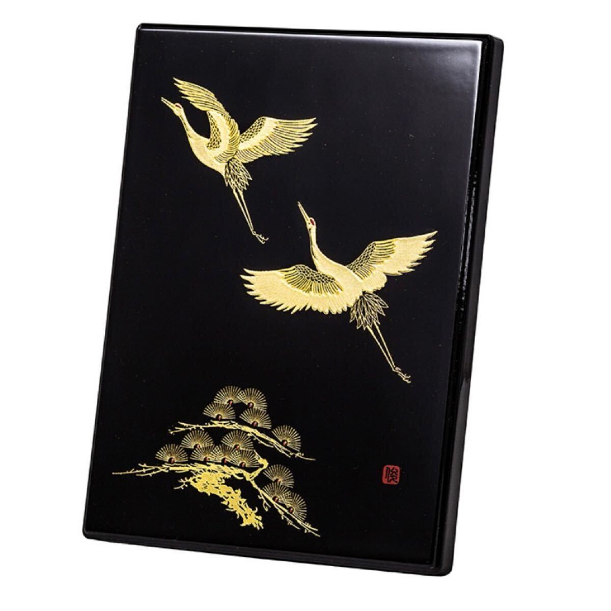 うるし塗の蓋に、明ばたく鶴を金色の時絵で描いた高級感のある小箱の電報台紙です。