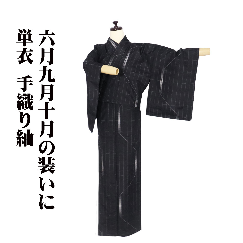 | 色・柄 | 単衣 手織り紬 黒(黒色)地 幾何模様・縞 (写真では上手く色が出ない場合があります。ご了承下さい) |