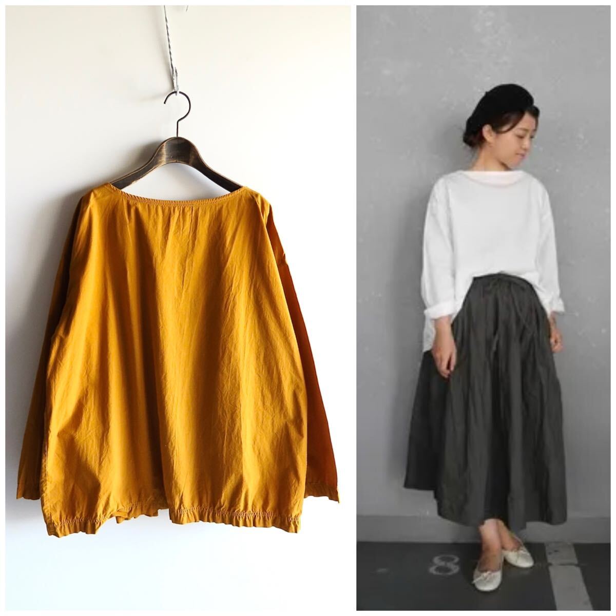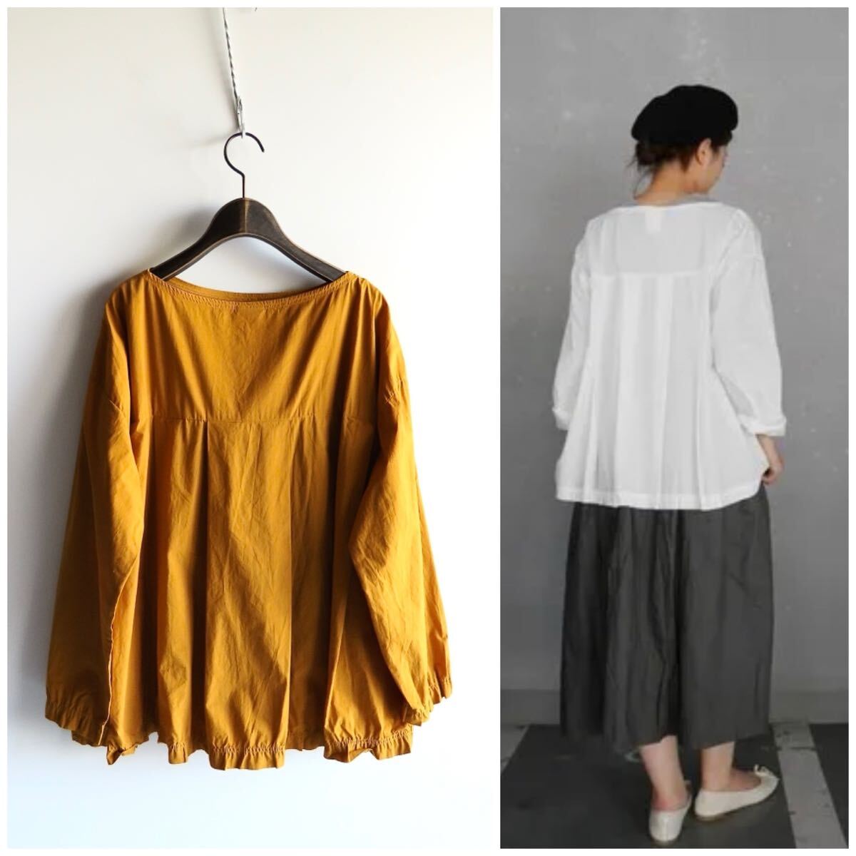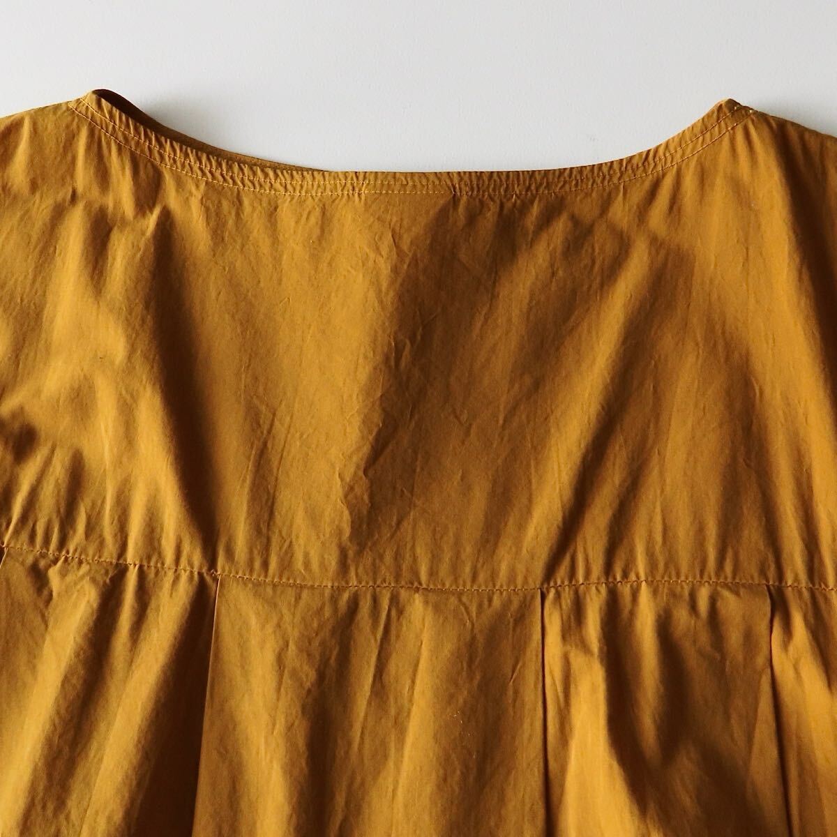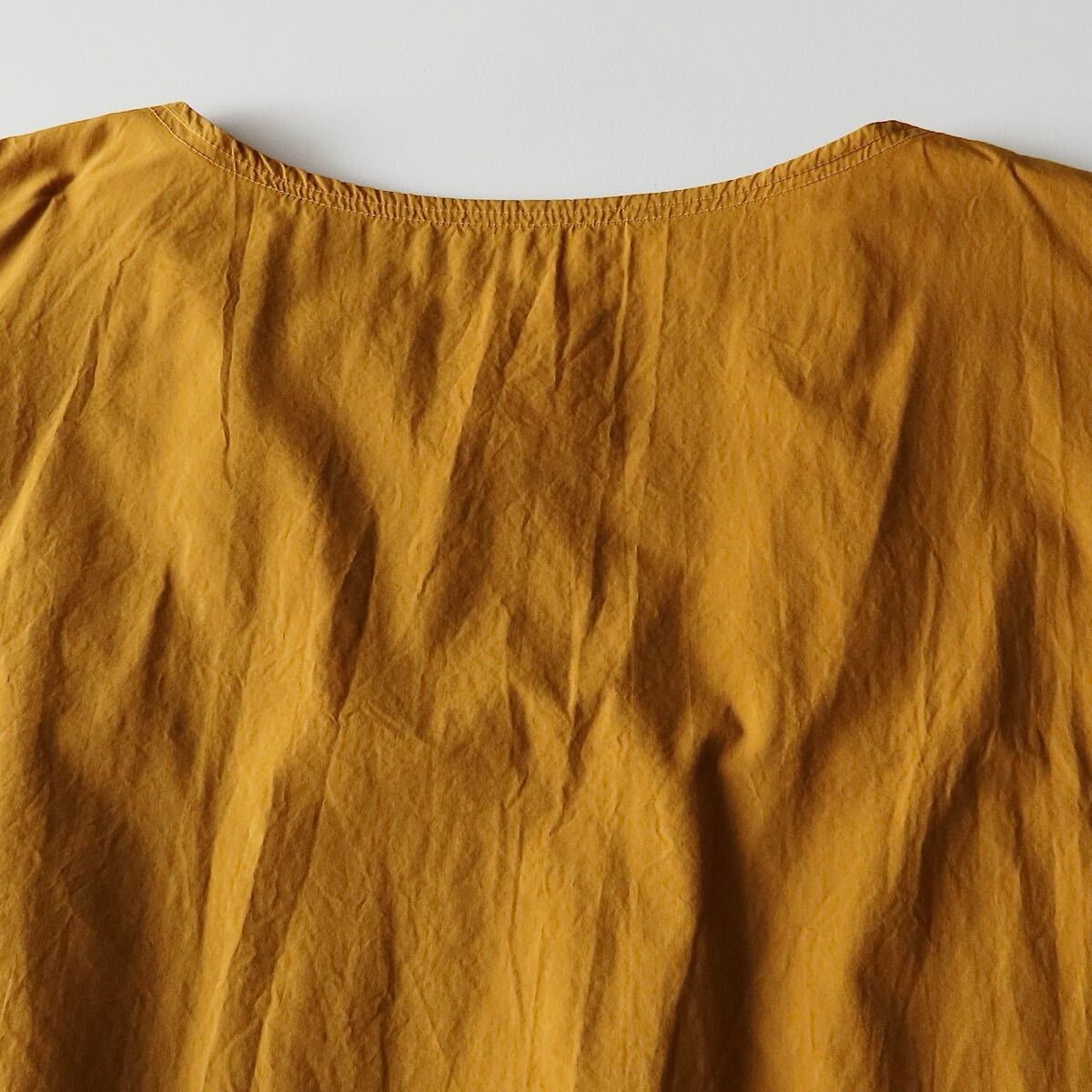 塩縮加工を施した風合いある製品染めタックプルオーバーブラウス。