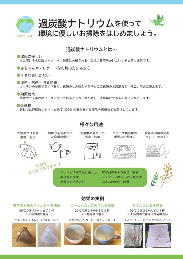 洗濯槽の洗浄や食洗機の洗剤他、多用途に使える過炭酸ナトリウム(酸素系漂白剤)です、有効酸素濃度13%以上、 原料に韓国の国際企業OCI の製品を国内で包装しています。 オキシクリーン同等品、オキシ漬けも出来ます。 包装の袋は破れにくい0.08mmのチャック(ジップ)付きボリ袋です。 ※領収書発行出来ます、お申し付けください。 ※使い方の簡単な説明書を添付しています。 ※資源とコスト節約のため簡易包装にしていますが、破袋など有りました ら、輸送中を含め責任をもって対応させて頂きます。 ※その他ご要望などございましたらコメントにて連絡下さい、出来る限り対応せて頂きます。 ※クエン酸と重曹の販売も行っています。 匿名配送可。他にも数量違いを色々出品しています、ご確認ください。 #過炭酸ナトリウム #酸素系漂白剤 #オキシクリーン #洗濯槽クリーナー #漂白 #カビ #消臭#脱臭 #除菌#殺菌